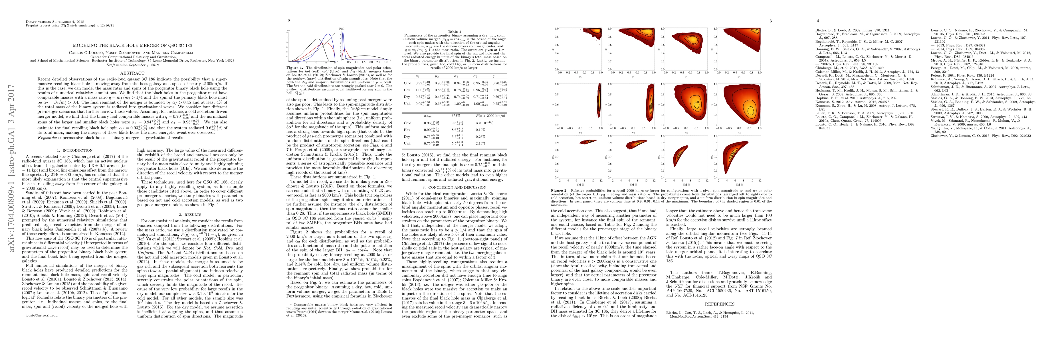 This paper models the merger of supermassive black holes in the quasar 3C 186, finding a recoiling black hole moving at 2100km/s. The progenitor black holes had comparable masses and high spins, with the final remnant having a spin greater than 0.45, and at least 4% of the total mass radiated as gravitational waves.