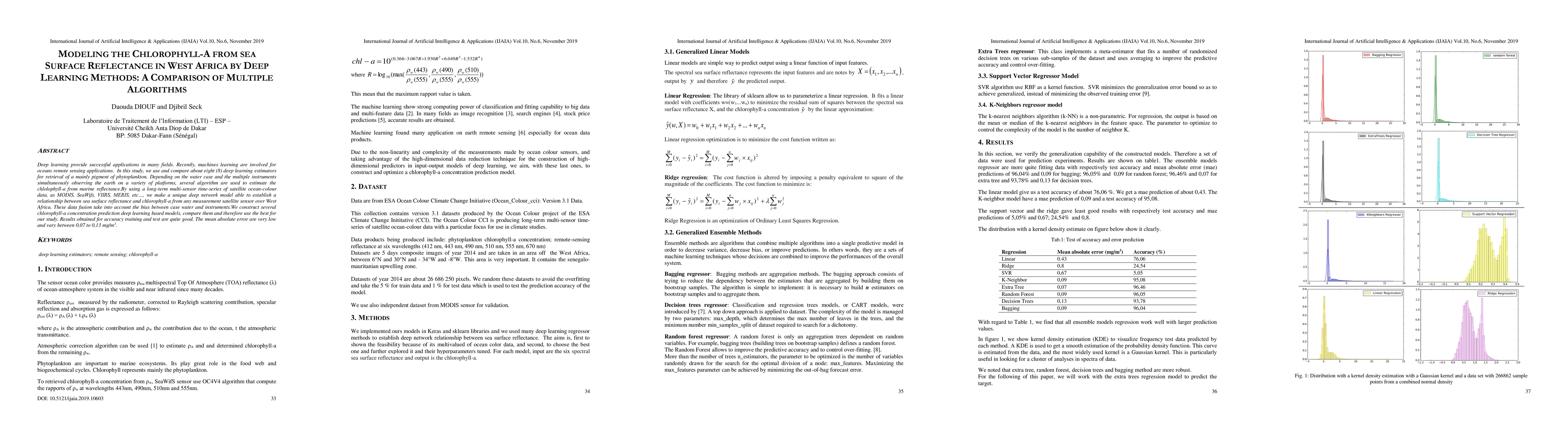 This study compares eight deep learning algorithms to model chlorophyll-a from sea surface reflectance in West Africa using multi-sensor satellite data. The best-performing model demonstrates high accuracy with mean absolute errors ranging from 0.07 to 0.13 mg/m³.