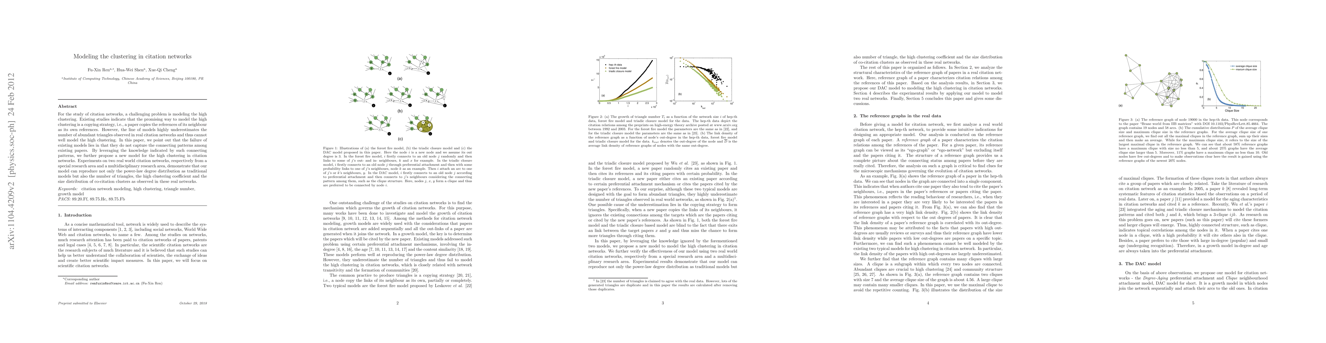 For the study of citation networks, a challenging problem is modeling the high clustering. Existing studies indicate that the promising way to model the high clustering is a copying strategy, i.e., a paper copies the references of its neighbour as its own references. However, the line of models highly underestimates the number of abundant triangles observed in real citation networks and thus cannot well model the high clustering. In this paper, we point out that the failure of existing models lies in that they do not capture the connecting patterns among existing papers. By leveraging the knowledge indicated by such connecting patterns, we further propose a new model for the high clustering in citation networks. Experiments on two real world citation networks, respectively from a special research area and a multidisciplinary research area, demonstrate that our model can reproduce not only the power-law degree distribution as traditional models but also the number of triangles, the high clustering coefficient and the size distribution of co-citation clusters as observed in these real networks.