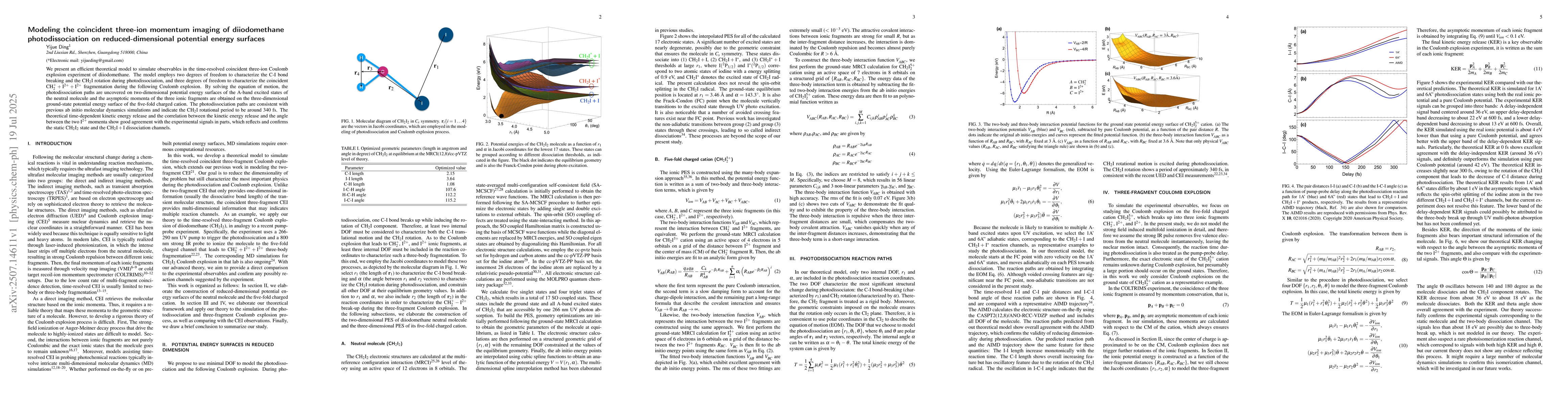 We present an efficient theoretical model to simulate observables in the time-resolved coincident three-ion Coulomb explosion experiment of diiodomethane. The model employs two degrees of freedom to characterize the C-I bond breaking and the $\text{CH}_2\text{I}$ rotation during photodissociation, and three degrees of freedom to characterize the coincident $\text{CH}_2^{+}+\text{I}^{2+}+\text{I}^{2+}$ fragmentation during the following Coulomb explosion. By solving the equation of motion, the photodissociation paths are uncovered on two-dimensional potential energy surfaces of the A-band excited states of the neutral molecule and the asymptotic momenta of the three ionic fragments are obtained on the three-dimensional ground-state potential energy surface of the five-fold charged cation. The photodissociation paths are consistent with previous ab initio molecular dynamics simulations and indicate the $\text{CH}_2\text{I}$ rotational period to be around 340 fs. The theoretical time-dependent kinetic energy release and the correlation between the kinetic energy release and the angle between the two $\text{I}^{2+}$ momenta show good agreement with the experimental signals in parts, which reflects and confirms the static $\text{CH}_2\text{I}_2$ state and the $\text{CH}_2\text{I}+\text{I}$ dissociation channels.