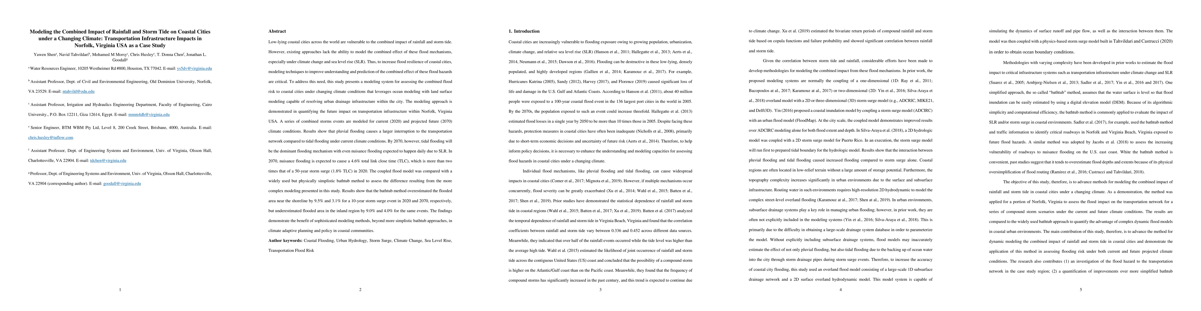 Low-lying coastal cities across the world are vulnerable to the combined impact of rainfall and storm tide. However, existing approaches lack the ability to model the combined effect of these flood mechanisms. Thus, to increase flood resilience, modeling techniques to improve understanding and prediction of the combined effect of these flood hazards are critical. To address this need, this study presents a modeling system for assessing the combined flood risk to coastal cities under changing climate conditions that leverages ocean modeling with land surface modeling capable of resolving urban drainage infrastructure within the city. The modeling approach is demonstrated in quantifying the future impact on transportation infrastructure within Norfolk, Virginia USA. A series of combined storms events are modeled for current (2020) and projected future (2070) climate conditions. Results show that pluvial flooding causes a larger interruption to the transportation network compared to tidal flooding under current climate conditions. By 2070, however, tidal flooding will be the dominant flooding mechanism with even nuisance flooding expected to happen daily due to SLR. In 2070, nuisance flooding is expected to cause a 4.6% total link close time (TLC), which is more than two times that of a 50-year storm surge (1.8% TLC) in 2020. The coupled model was compared with a widely used but physically simplistic bathtub method to assess the difference resulting from the more complex modeling presented. Results show that the bathtub method overestimated the flooded area near the shoreline by 9.5% and 3.1% for a 10-year storm surge event in 2020 and 2070, respectively, but underestimated flooded area in the inland region by 9.0% and 4.0% for the same events. The findings demonstrate the benefit of sophisticated modeling methods in climate adaptive planning and policy in coastal communities.