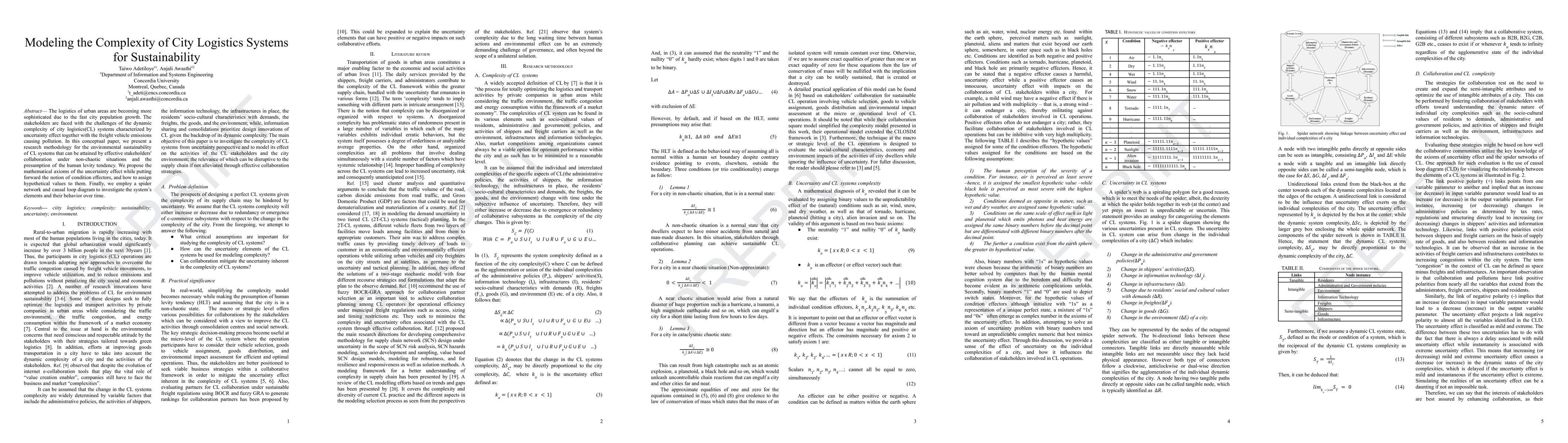 The logistics of urban areas are becoming more sophisticated due to the fast city population growth. The stakeholders are faced with the challenges of the dynamic complexity of city logistics(CL) systems characterized by the uncertainty effect together with the freight vehicle emissions causing pollution. In this conceptual paper, we present a research methodology for the environmental sustainability of CL systems that can be attained by effective stakeholders' collaboration under non-chaotic situations and the presumption of the human levity tendency. We propose the mathematical axioms of the uncertainty effect while putting forward the notion of condition effectors, and how to assign hypothetical values to them. Finally, we employ a spider network and causal loop diagram to investigate the system's elements and their behavior over time.