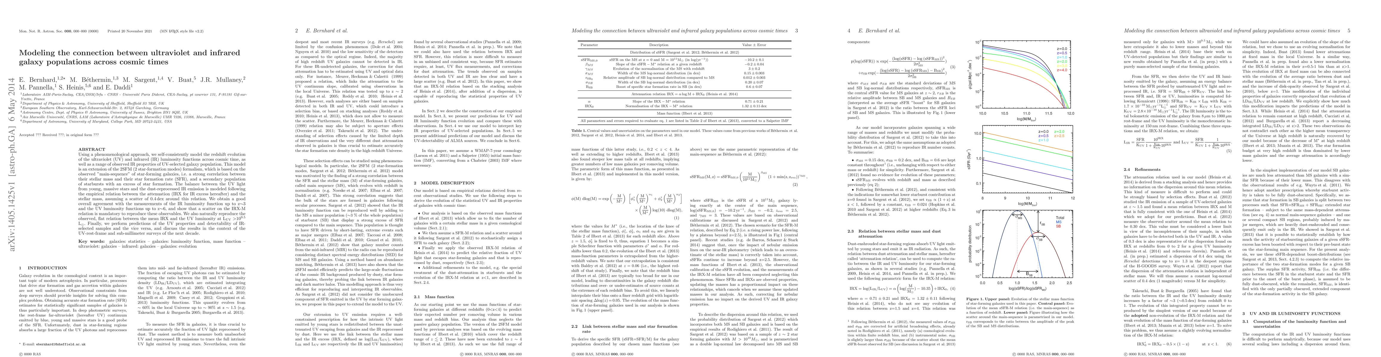 Using a phenomenological approach, we self-consistently model the redshift evolution of the ultraviolet (UV) and infrared (IR) luminosity functions across cosmic time, as well as a range of observed IR properties of UV-selected galaxy population. This model is an extension of the 2SFM (2 star-formation modes) formalism, which is based on the observed "main-sequence" of star-forming galaxies, i.e. a strong correlation between their stellar mass and their star formation rate (SFR), and a secondary population of starbursts with an excess of star formation. The balance between the UV light from young, massive stars and the dust-reprocessed IR emission is modeled following the empirical relation between the attenuation (IRX for IR excess hereafter) and the stellar mass, assuming a scatter of 0.4\,dex around this relation. We obtain a good overall agreement with the measurements of the IR luminosity function up to z~3 and the UV luminosity functions up to z~6, and show that a scatter on the IRX-M relation is mandatory to reproduce these observables. We also naturally reproduce the observed, flat relation between the mean IRX and the UV luminosity at L$_{\rm UV}>$10$^{9.5}$ L$_\odot$. Finally, we perform predictions of the UV properties and detectability of IR-selected samples and the vice versa, and discuss the results in the context of the UV-rest-frame and sub-millimeter surveys of the next decade.