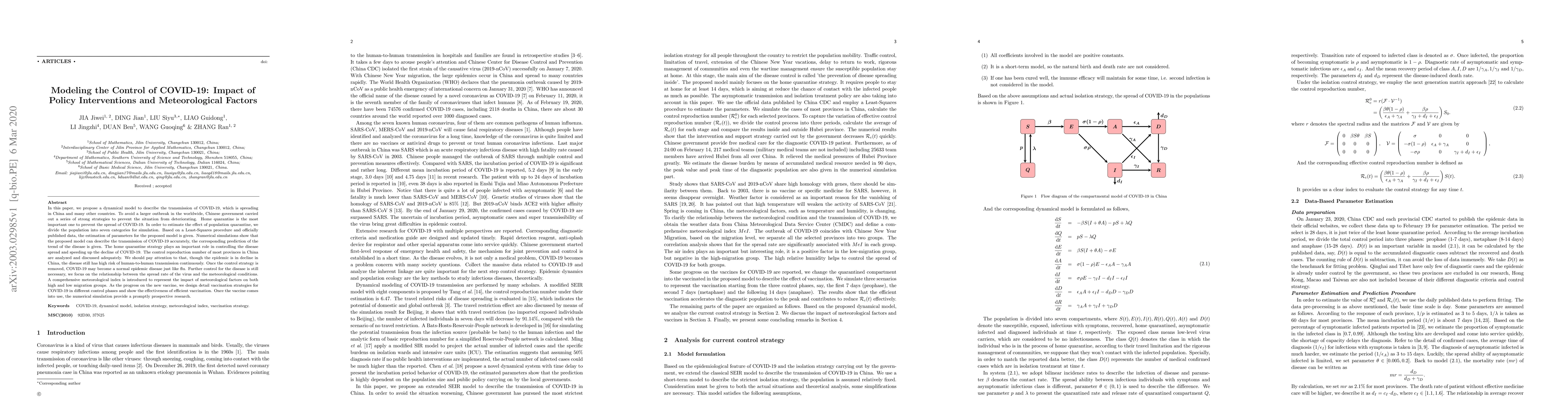 In this paper, we propose a dynamical model to describe the transmission of COVID-19, which is spreading in China and many other countries. To avoid a larger outbreak in the worldwide, Chinese government carried out a series of strong strategies to prevent the situation from deteriorating. Home quarantine is the most important one to prevent the spread of COVID-19. In order to estimate the effect of population quarantine, we divide the population into seven categories for simulation. Based on a Least-Squares procedure and officially published data, the estimation of parameters for the proposed model is given. Numerical simulations show that the proposed model can describe the transmission of COVID-19 accurately, the corresponding prediction of the trend of the disease is given. The home quarantine strategy plays an important role in controlling the disease spread and speeding up the decline of COVID-19. The control reproduction number of most provinces in China are analyzed and discussed adequately. We should pay attention to that, though the epidemic is in decline in China, the disease still has high risk of human-to-human transmission continuously. Once the control strategy is removed, COVID-19 may become a normal epidemic disease just like flu. Further control for the disease is still necessary, we focus on the relationship between the spread rate of the virus and the meteorological conditions. A comprehensive meteorological index is introduced to represent the impact of meteorological factors on both high and low migration groups. As the progress on the new vaccine, we design detail vaccination strategies for COVID-19 in different control phases and show the effectiveness of efficient vaccination. Once the vaccine comes into use, the numerical simulation provide a promptly prospective research.