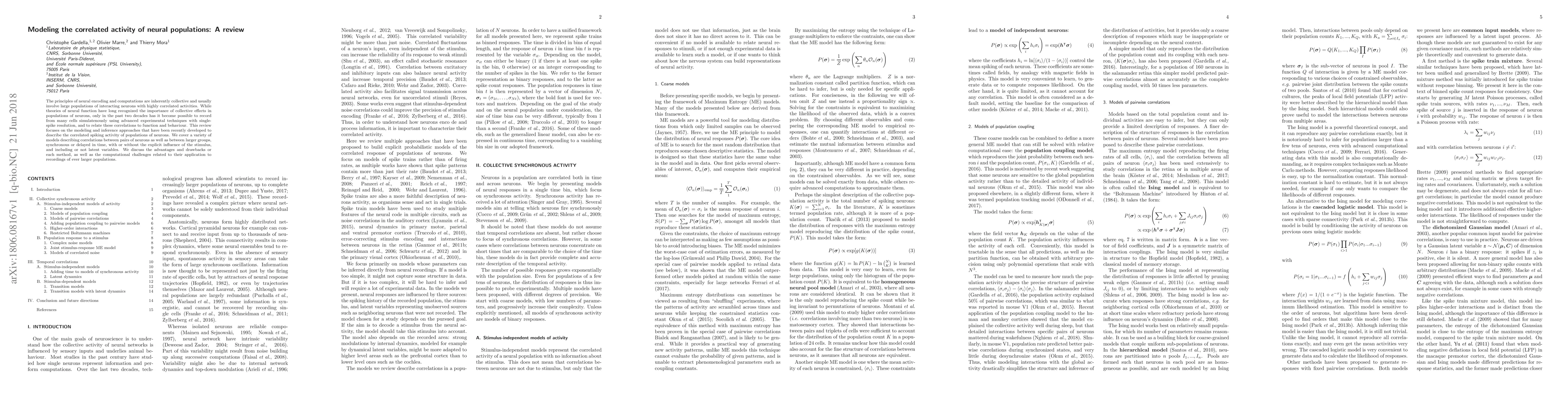 The principles of neural encoding and computations are inherently collective and usually involve large populations of interacting neurons with highly correlated activities. While theories of neural function have long recognized the importance of collective effects in populations of neurons, only in the past two decades has it become possible to record from many cells simulatenously using advanced experimental techniques with single-spike resolution, and to relate these correlations to function and behaviour. This review focuses on the modeling and inference approaches that have been recently developed to describe the correlated spiking activity of populations of neurons. We cover a variety of models describing correlations between pairs of neurons as well as between larger groups, synchronous or delayed in time, with or without the explicit influence of the stimulus, and including or not latent variables. We discuss the advantages and drawbacks or each method, as well as the computational challenges related to their application to recordings of ever larger populations.