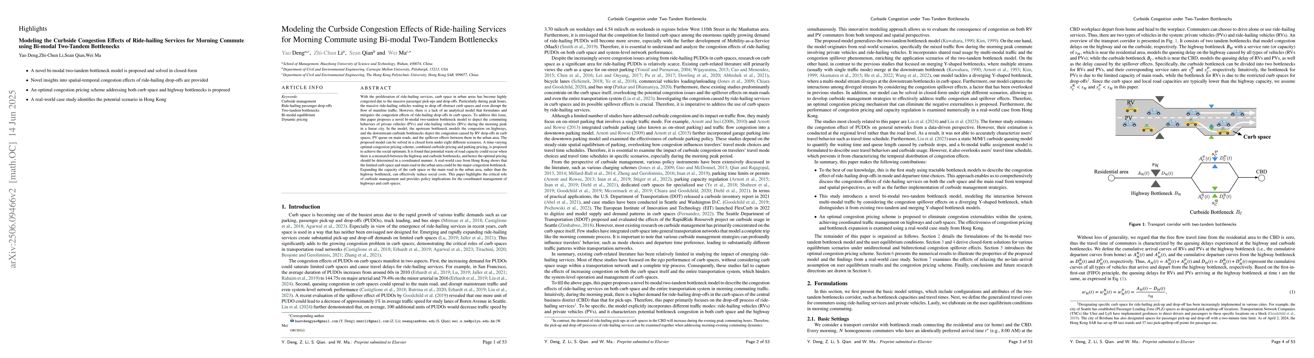 A new model suggests that ride-hailing services cause significant curb space congestion during peak hours, and proposes a bi-modal two-tandem bottleneck approach to mitigate this issue with optimal pricing schemes.