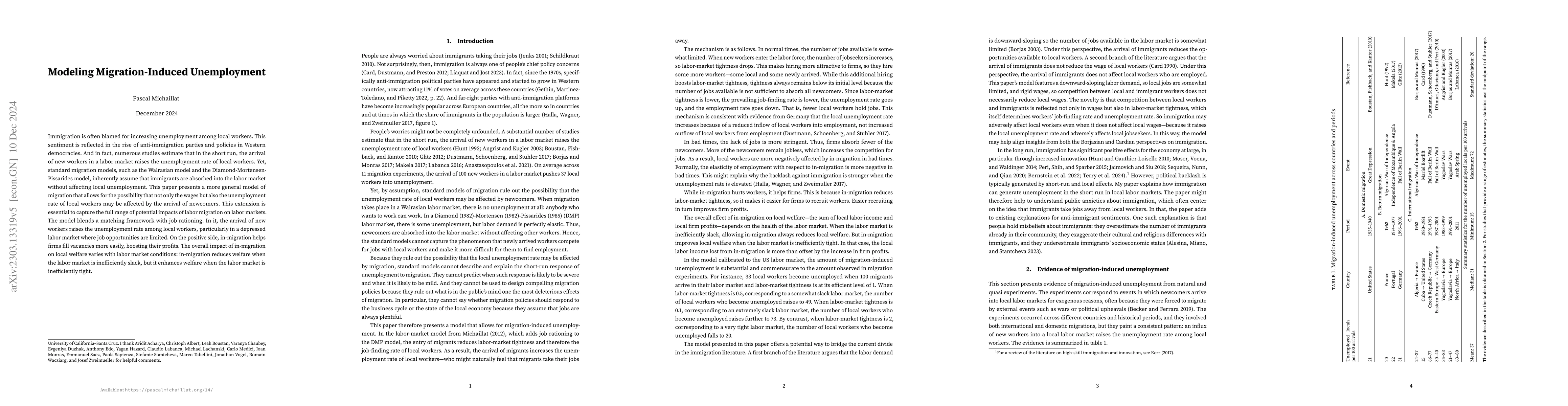 This paper proposes a new immigration model that allows for the displacement of native workers by immigrants, contrasting with traditional models. It finds that while immigration can increase native unemployment, it also eases firm recruitment and improves profits, with the overall impact on native welfare contingent on the existing labor market conditions.