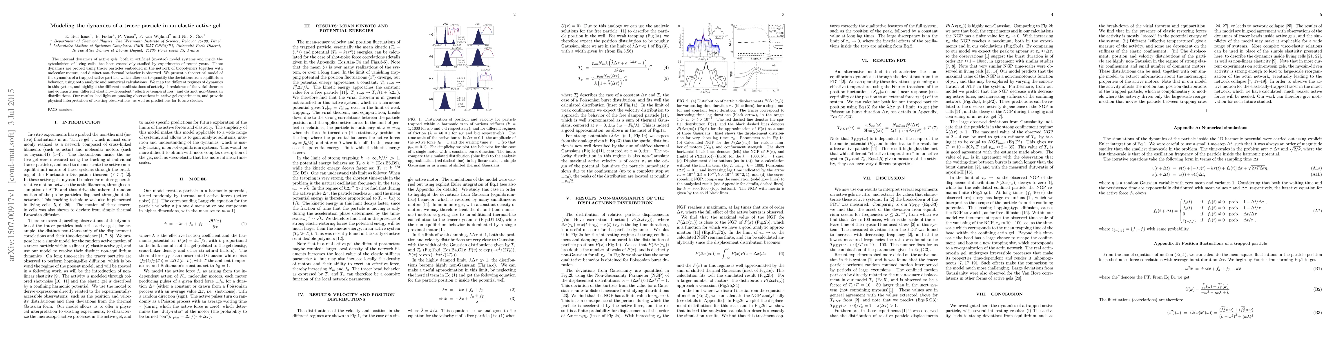 This research presents a theoretical model for understanding the movement of a tracer particle within an active gel, revealing non-equilibrium behaviors such as virial theorem breakdown and distinct non-Gaussian distributions. The study offers insights into active gel experiments and predictions for future research.