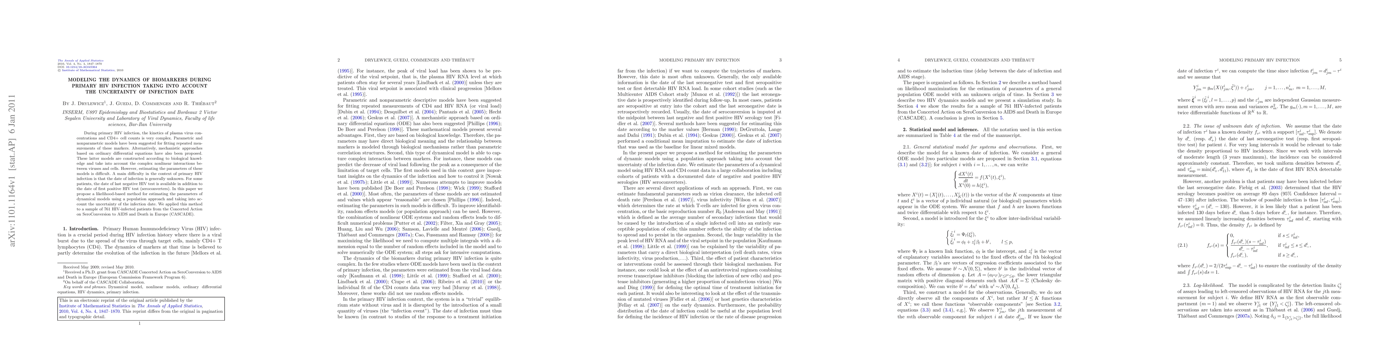 This paper proposes a likelihood-based method to estimate parameters of dynamical models for biomarkers during primary HIV infection, addressing the challenge of uncertain infection dates. The method was applied to a population of 761 patients to model the complex interactions between plasma virus concentrations and CD4+ cell counts.