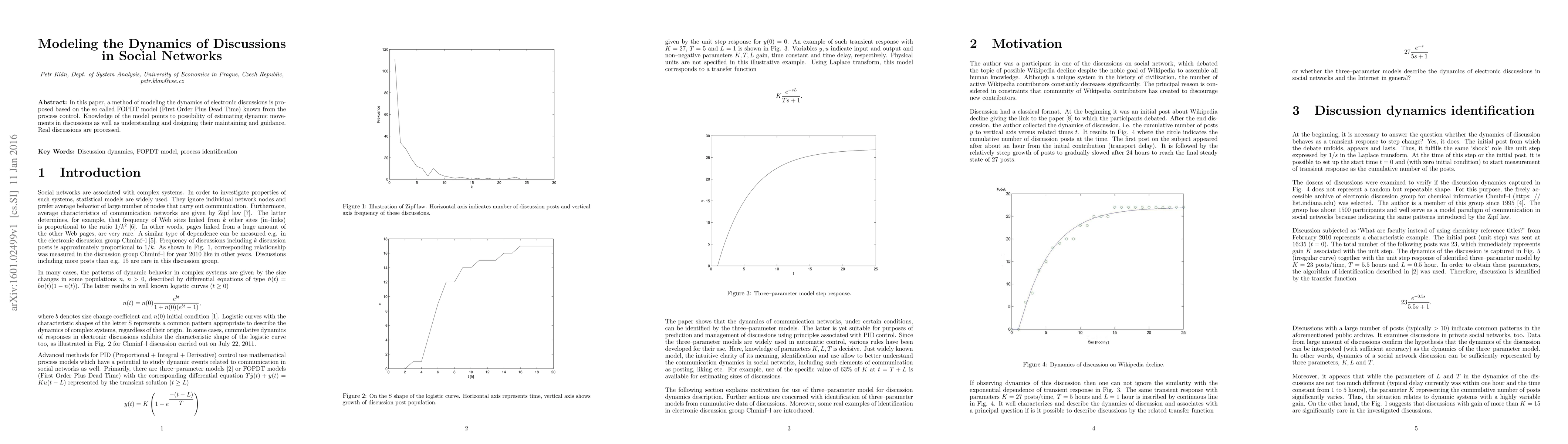 In this paper, a method of modeling the dynamics of electronic discussions is proposed based on the so called FOPDT model (First Order Plus Dead Time) known from the process control. Knowledge of the model points to possibility of estimating dynamic movements in discussions as well as understanding and designing their maintaining and guidance. Real discussions are processed.