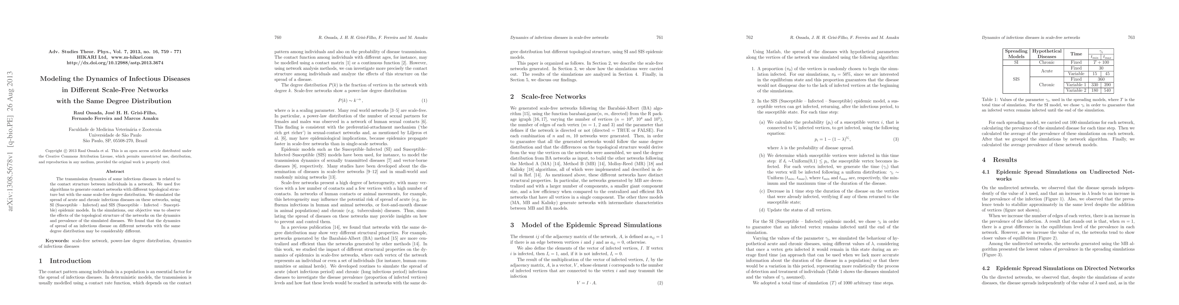 This study models infectious disease dynamics on scale-free networks with identical degree distributions but varying topological structures. Using SI and SIS epidemic models, researchers found significant differences in disease spread and prevalence across networks, highlighting the impact of network topology on infectious disease dynamics.