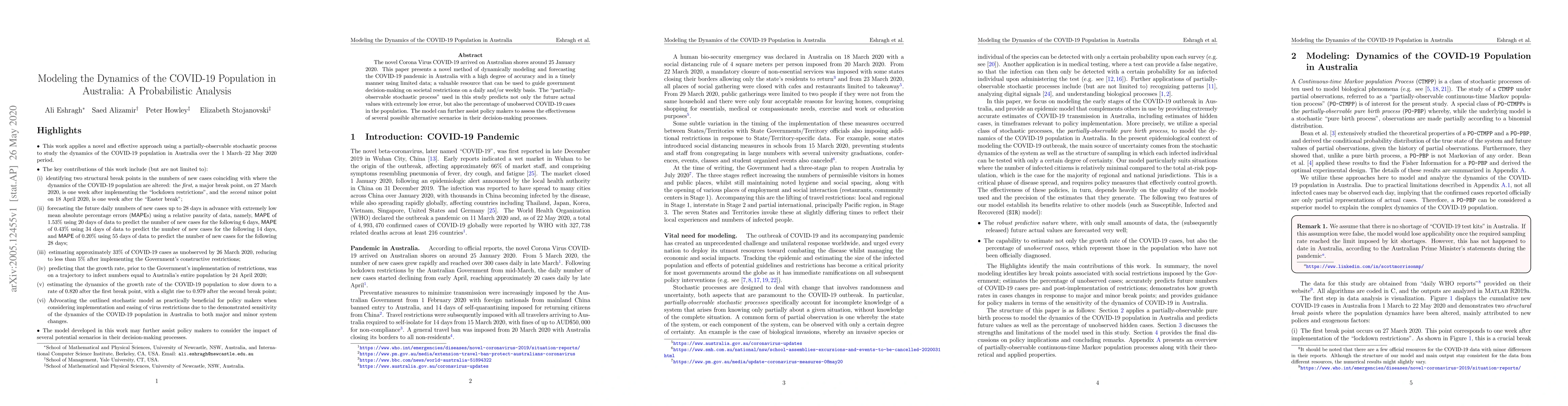 The novel Corona Virus COVID-19 arrived on Australian shores around 25 January 2020. This paper presents a novel method of dynamically modeling and forecasting the COVID-19 pandemic in Australia with a high degree of accuracy and in a timely manner using limited data; a valuable resource that can be used to guide government decision-making on societal restrictions on a daily and/or weekly basis. The "partially-observable stochastic process" used in this study predicts not only the future actual values with extremely low error, but also the percentage of unobserved COVID-19 cases in the population. The model can further assist policy makers to assess the effectiveness of several possible alternative scenarios in their decision-making processes.