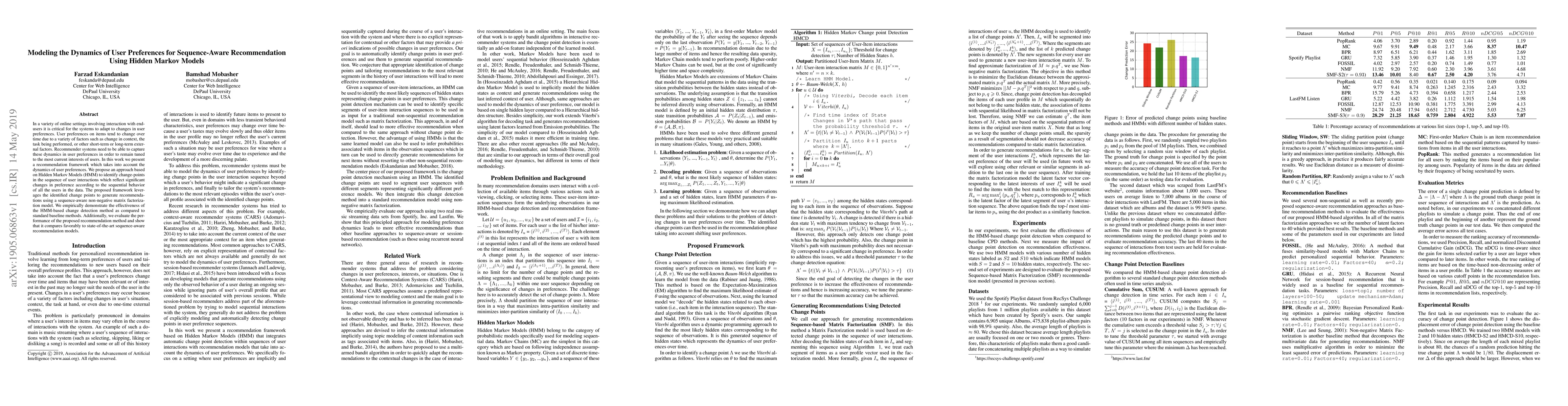 In a variety of online settings involving interaction with end-users it is critical for the systems to adapt to changes in user preferences. User preferences on items tend to change over time due to a variety of factors such as change in context, the task being performed, or other short-term or long-term external factors. Recommender systems need to be able to capture these dynamics in user preferences in order to remain tuned to the most current interests of users. In this work we present a recommendation framework which takes into account the dynamics of user preferences. We propose an approach based on Hidden Markov Models (HMM) to identify change-points in the sequence of user interactions which reflect significant changes in preference according to the sequential behavior of all the users in the data. The proposed framework leverages the identified change points to generate recommendations using a sequence-aware non-negative matrix factorization model. We empirically demonstrate the effectiveness of the HMM-based change detection method as compared to standard baseline methods. Additionally, we evaluate the performance of the proposed recommendation method and show that it compares favorably to state-of-the-art sequence-aware recommendation models.