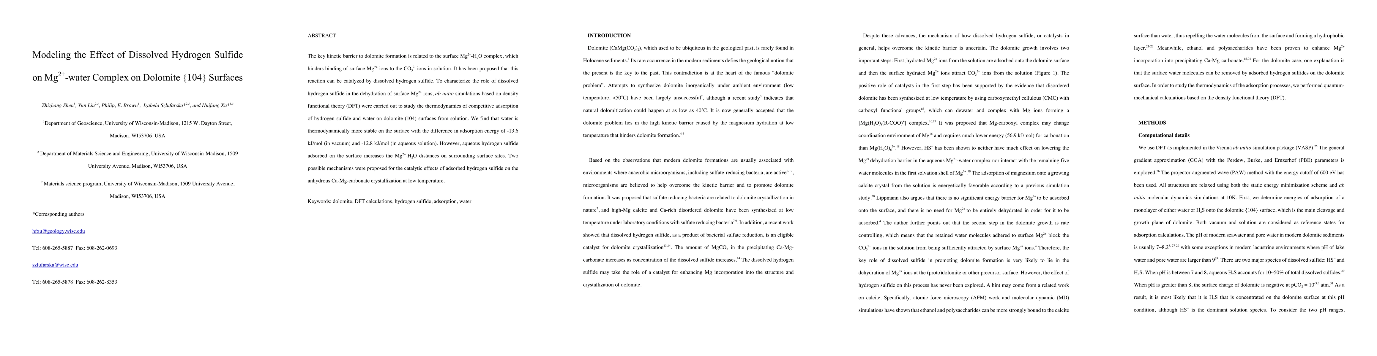 The key kinetic barrier to dolomite formation is related to the surface Mg2+-H2O complex, which hinders binding of surface Mg2+ ions to the CO3 2- ions in solution. It has been proposed that this reaction can be catalyzed by dissolved hydrogen sulfide. To characterize the role of dissolved hydrogen sulfide in the dehydration of surface Mg 2+ ions, ab initio simulations based on density functional theory (DFT) were carried out to study the thermodynamics of competitive adsorption of hydrogen sulfide and water on dolomite (104) surfaces from solution. We find that water is thermodynamically more stable on the surface with the difference in adsorption energy of -13.6 kJ/mol (in vacuum) and -12.8 kJ/mol (in aqueous solution). However, aqueous hydrogen sulfide adsorbed on the surface increases the Mg2+-H2O distances on surrounding surface sites. Two possible mechanisms were proposed for the catalytic effects of adsorbed hydrogen sulfide on the anhydrous Ca-Mg-carbonate crystallization at low temperature.