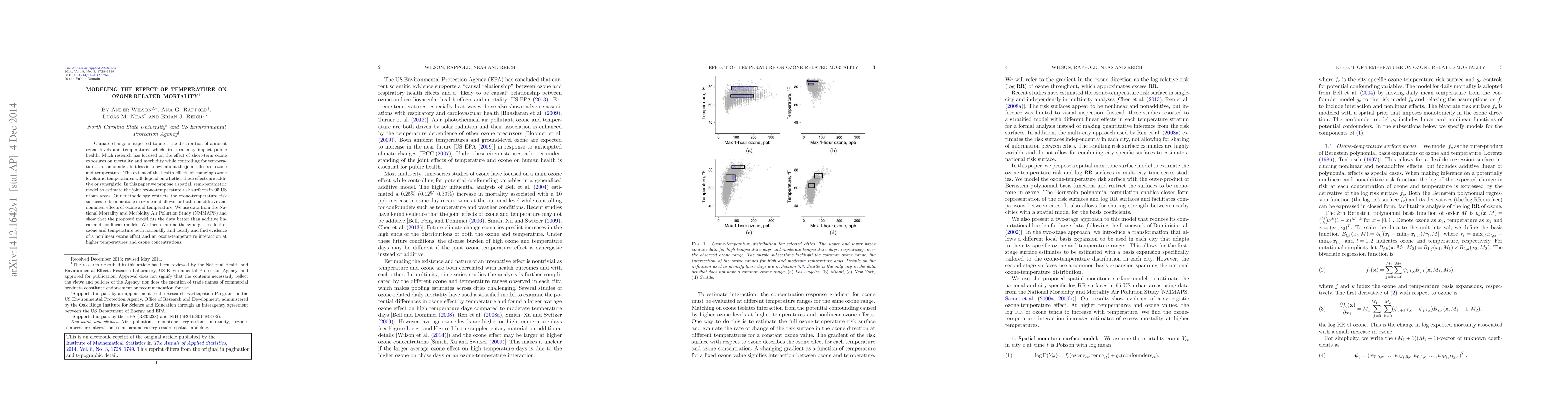 This paper proposes a spatial, semi-parametric model to estimate the joint effects of ozone and temperature on mortality in 95 US urban areas, finding evidence of synergistic interactions at higher concentrations and temperatures, and demonstrating better fit compared to additive models.