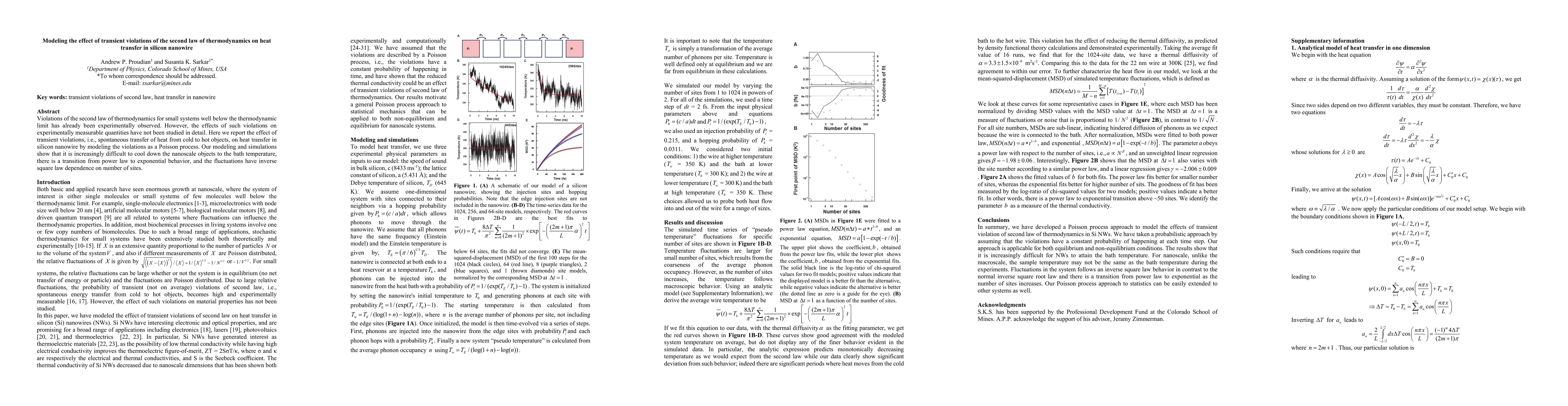 Violations of the second law of thermodynamics for small systems well below the thermodynamic limit has already been experimentally observed. However, the effects of such violations on experimentally measurable quantities have not been studied in detail. Here we report the effect of transient violations, i.e., spontaneous transfer of heat from cold to hot objects, on heat transfer in silicon nanowire by modeling the violations as a Poisson process. Our modeling and simulations show that it is increasingly difficult to cool down the nanoscale objects to the bath temperature, there is a transition from power law to exponential behavior, and the fluctuations have inverse square law dependence on number of sites.