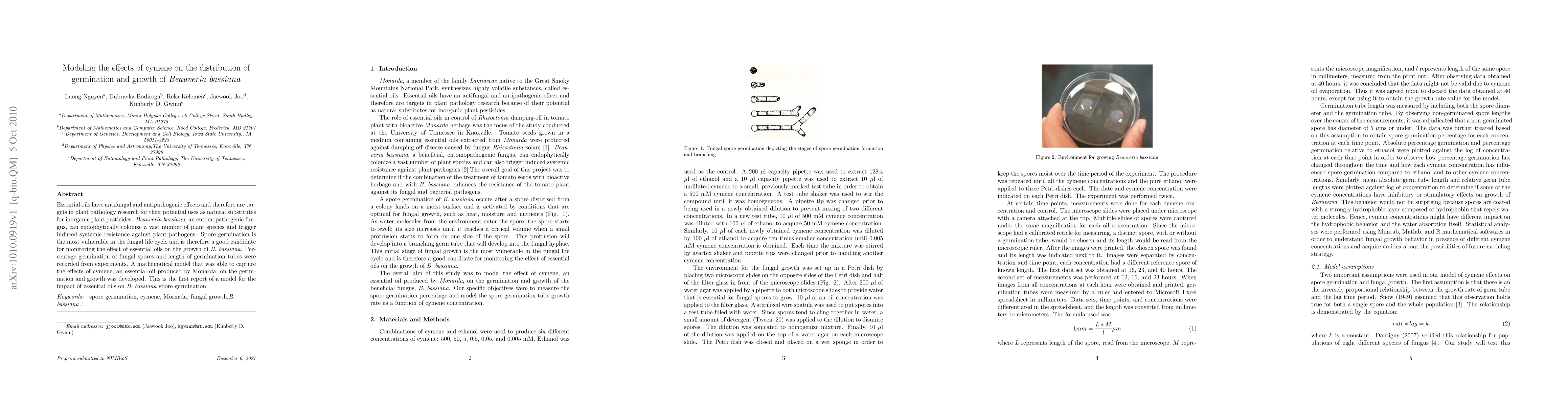 Essential oils have antifungal and antipathogenic effects and therefore are targets in plant pathology research for their potential uses as natural substitutes for inorganic plant pesticides. Beauveria bassiana, an entomopathogenic fungus, can endophytically colonize a vast number of plant species and trigger induced systemic resistance against plant pathogens. Spore germination is the most vulnerable in the fungal life cycle and is therefore a good candidate for monitoring the effect of essential oils on the growth of B. bassiana. Percentage germination of fungal spores and length of germination tubes were recorded from experiments. A mathematical model that was able to capture the effects of cymene, an essential oil produced by Monarda, on the germination and growth was developed. This is the first report of a model for the impact of essential oils on B. bassiana spore germination.