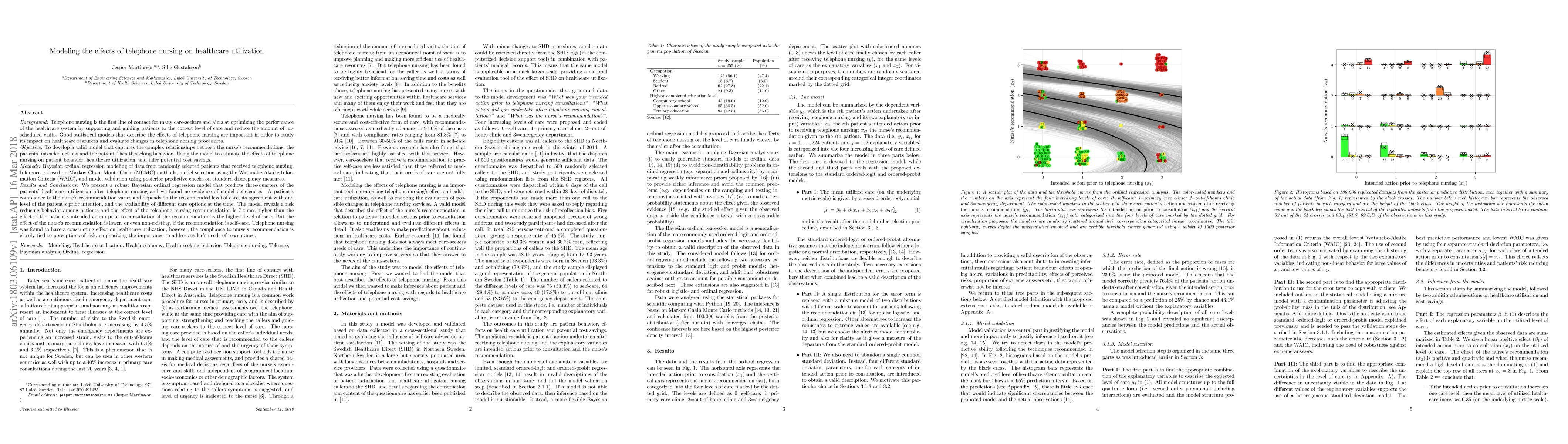 Background: Telephone nursing is the first line of contact for many care-seekers and aims at optimizing the performance of the healthcare system by supporting and guiding patients to the correct level of care and reduce the amount of unscheduled visits. Good statistical models that describe the effects of telephone nursing are important in order to study its impact on healthcare resources and evaluate changes in telephone nursing procedures. Objective: To develop a valid model that captures the complex relationships between the nurse's recommendations, the patients' intended actions and the patients' health seeking behavior. Using the model to estimate the effects of telephone nursing on patient behavior, healthcare utilization, and infer potential cost savings. Methods: Bayesian ordinal regression modeling of data from randomly selected patients that received telephone nursing. Inference is based on Markov Chain Monte Carlo methods, model selection using the Watanabe-Akaike Information Criteria, and model validation using posterior predictive checks on standard discrepancy measures. Results and Conclusions: We present a robust Bayesian ordinal regression model that predicts 76% of the patients' healthcare utilization after telephone nursing and we found no evidence of model deficiencies. The model reveals a risk reducing behavior and the effect of the telephone nursing recommendation is 7 times higher than the effect of the patient's intended action prior to consultation if the recommendation is the highest level of care. But the effect of the nurse's recommendation is lower, or even non-existing, if the recommendation is self-care. Telephone nursing was found to have a constricting effect on healthcare utilization, however, the compliance to nurse's recommendation is closely tied to perceptions of risk, emphasizing the importance to address caller's needs of reassurance.