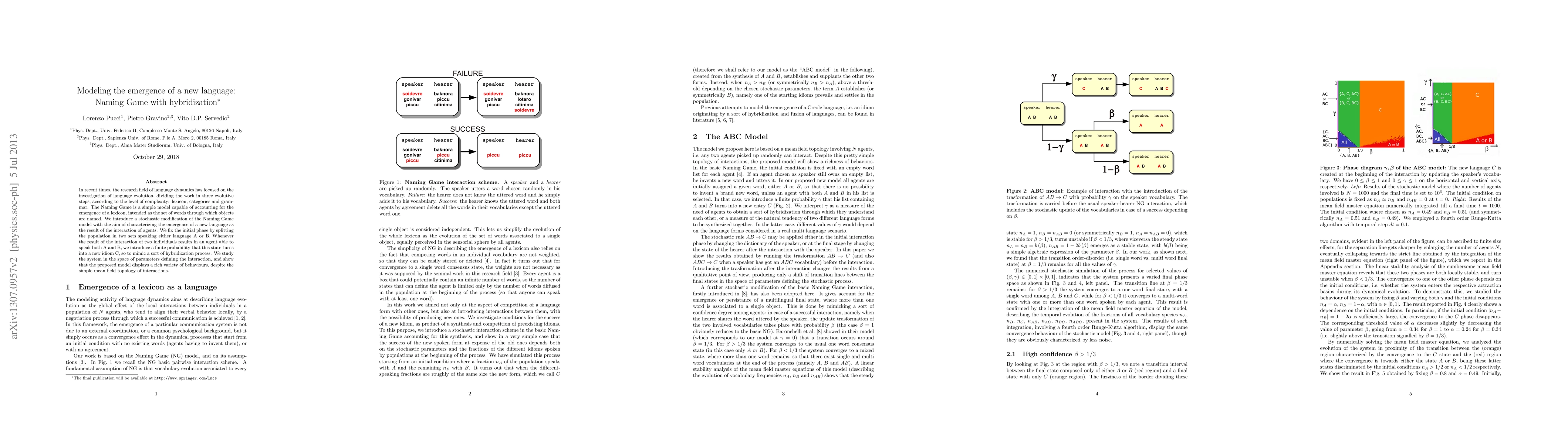 In recent times, the research field of language dynamics has focused on the investigation of language evolution, dividing the work in three evolutive steps, according to the level of complexity: lexicon, categories and grammar. The Naming Game is a simple model capable of accounting for the emergence of a lexicon, intended as the set of words through which objects are named. We introduce a stochastic modification of the Naming Game model with the aim of characterizing the emergence of a new language as the result of the interaction of agents. We fix the initial phase by splitting the population in two sets speaking either language A or B. Whenever the result of the interaction of two individuals results in an agent able to speak both A and B, we introduce a finite probability that this state turns into a new idiom C, so to mimic a sort of hybridization process. We study the system in the space of parameters defining the interaction, and show that the proposed model displays a rich variety of behaviours, despite the simple mean field topology of interactions.