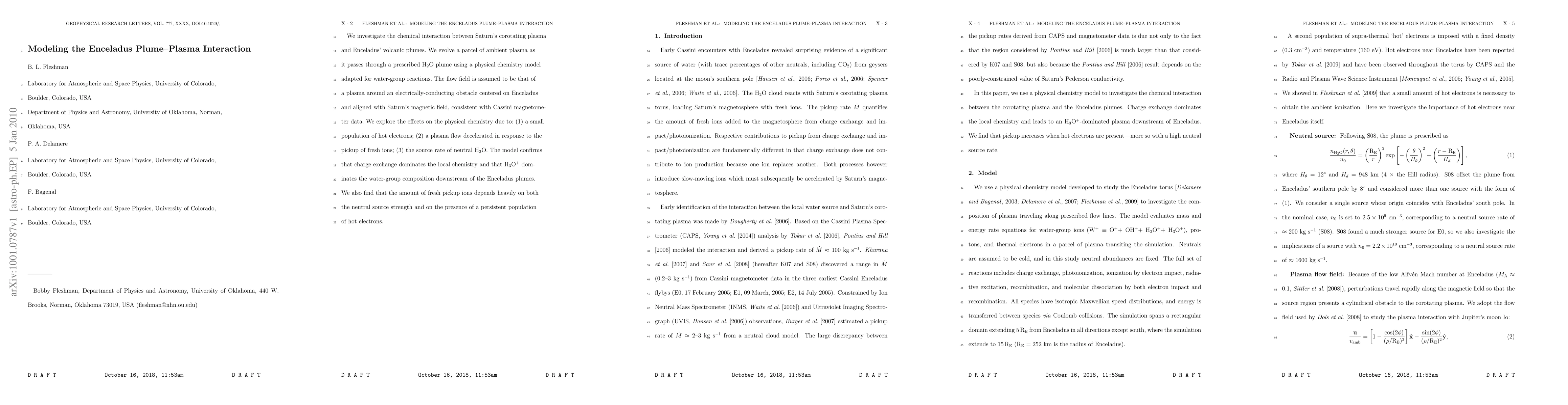 This study models the interaction between Saturn's plasma and Enceladus' volcanic plumes, finding that charge exchange dominates the chemistry, with H3O+ being the primary water-group ion downstream. The presence of hot electrons and the rate of neutral H2O significantly influence the amount of fresh pickup ions.