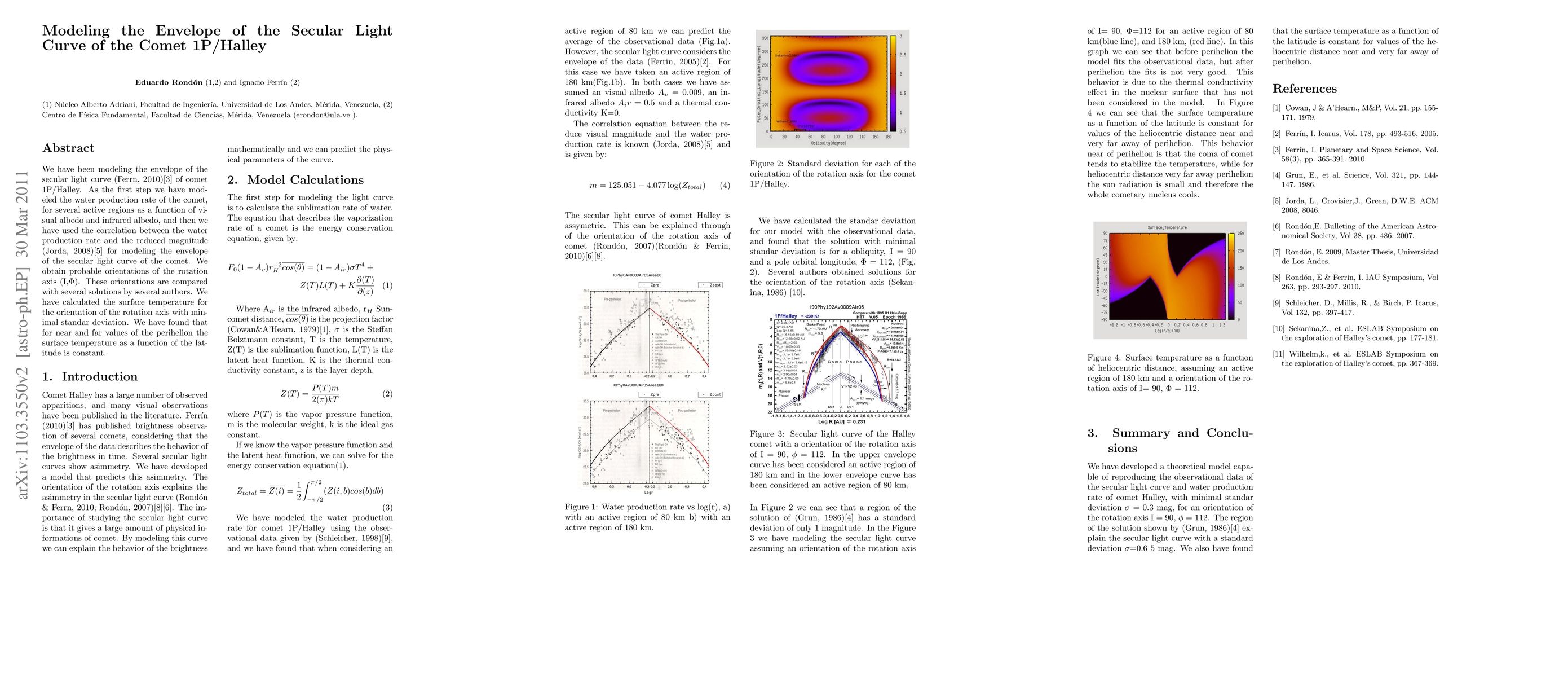 We have been modeling the envelope of the secular light curve (Ferr\'in, 2010) of comet 1P/Halley. As the first step we have modeled the water production rate of the comet, for several active regions as a function of visual albedo and infrared albedo, and then we have used the correlation between the water production rate and the reduced magnitude (Jorda, 2008) for modeling the envelope of the secular light curve of the comet. We obtain probable orientations of the rotation axis (I,$\Phi$). These orientations are compared with several solutions by several authors. We have calculated the surface temperature for the orientation of the rotation axis with minimal standar deviation. We have found that for near and far values of the perihelion the surface temperature as a function of the latitude is constant.