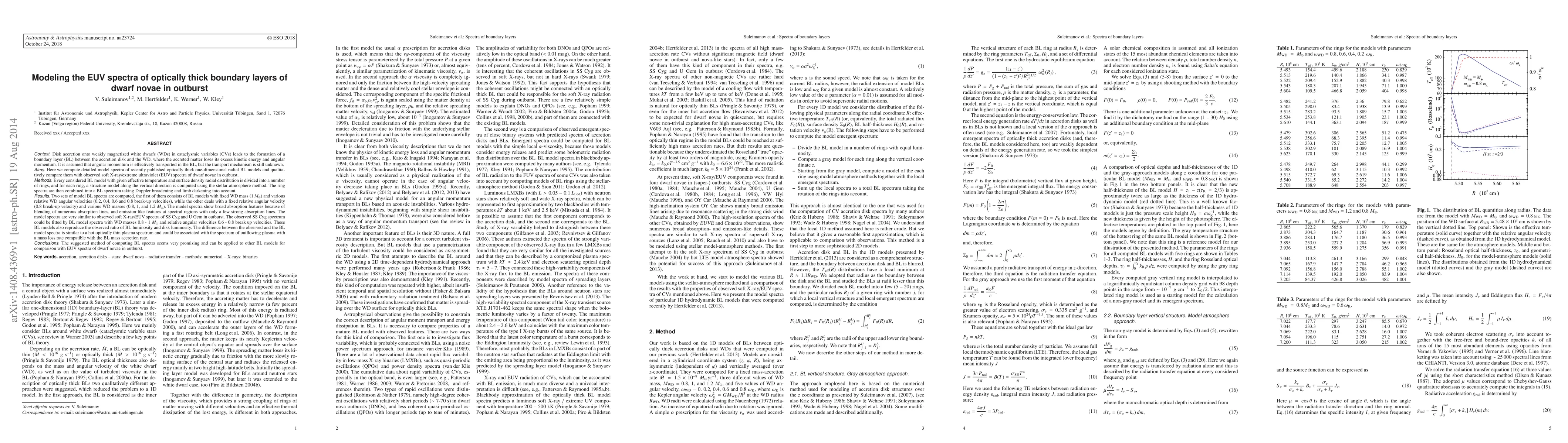 Researchers created detailed models of EUV spectra from optically thick boundary layers in dwarf novae, finding they match observed spectra for specific white dwarf masses and angular velocities, suggesting a promising method for comparing EUV spectra.