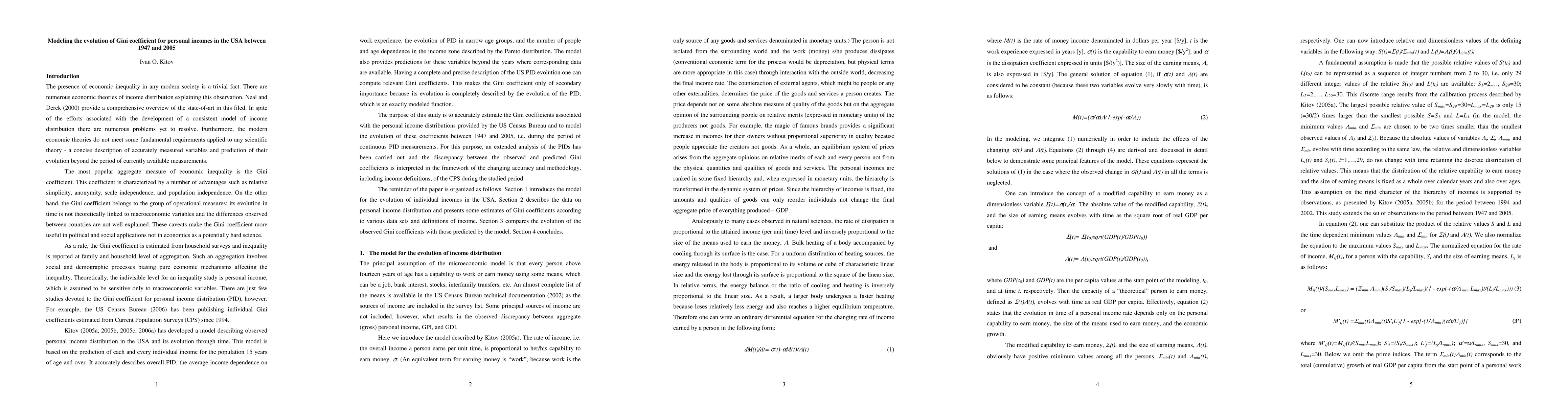 The Gini coefficient for personal incomes in the USA decreased from 0.64 to 0.54 between 1947 and 1990, but remained constant at around 0.51 from 1960 to 2005. The model accurately predicts this evolution based on changes in nominal GDP per capita.