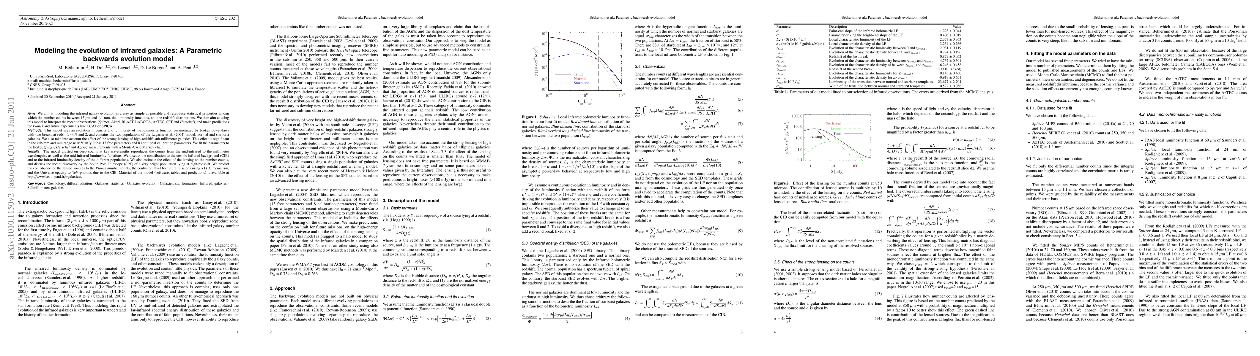 This paper presents a parametric backward evolution model to simplify the study of infrared galaxy evolution, focusing on statistical properties like number counts, luminosity functions, and redshift distributions. The model, calibrated to match observations from various infrared telescopes, predicts contributions to the cosmic infrared background and assesses the impact of lensing on high-redshift sub-millimeter galaxies, while also forecasting future mission performance and the universe's opacity to TeV photons.