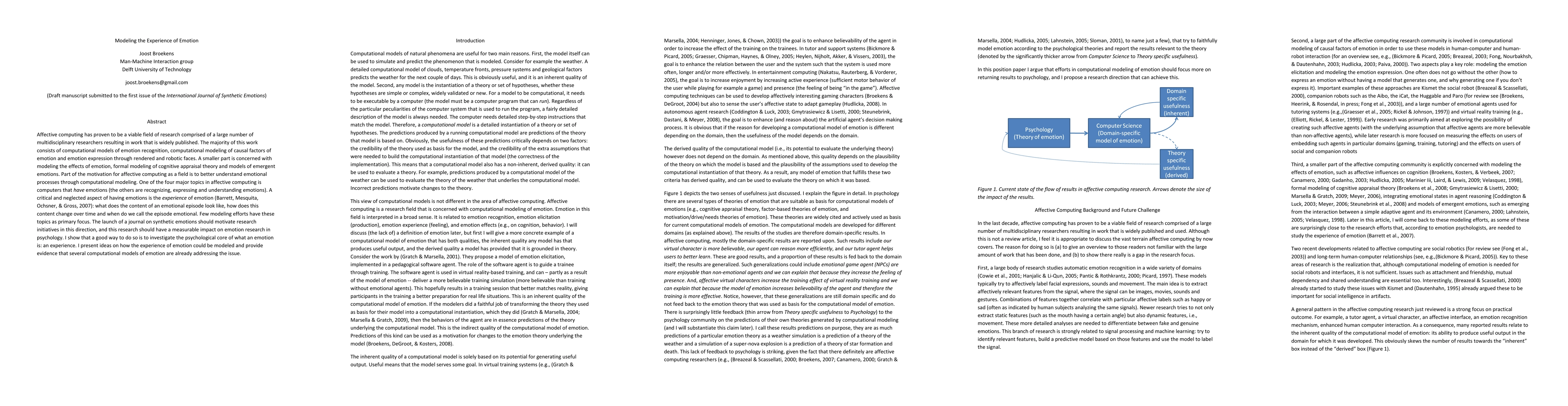 Affective computing has proven to be a viable field of research comprised of a large number of multidisciplinary researchers resulting in work that is widely published. The majority of this work consists of computational models of emotion recognition, computational modeling of causal factors of emotion and emotion expression through rendered and robotic faces. A smaller part is concerned with modeling the effects of emotion, formal modeling of cognitive appraisal theory and models of emergent emotions. Part of the motivation for affective computing as a field is to better understand emotional processes through computational modeling. One of the four major topics in affective computing is computers that have emotions (the others are recognizing, expressing and understanding emotions). A critical and neglected aspect of having emotions is the experience of emotion (Barrett, Mesquita, Ochsner, and Gross, 2007): what does the content of an emotional episode look like, how does this content change over time and when do we call the episode emotional. Few modeling efforts have these topics as primary focus. The launch of a journal on synthetic emotions should motivate research initiatives in this direction, and this research should have a measurable impact on emotion research in psychology. I show that a good way to do so is to investigate the psychological core of what an emotion is: an experience. I present ideas on how the experience of emotion could be modeled and provide evidence that several computational models of emotion are already addressing the issue.