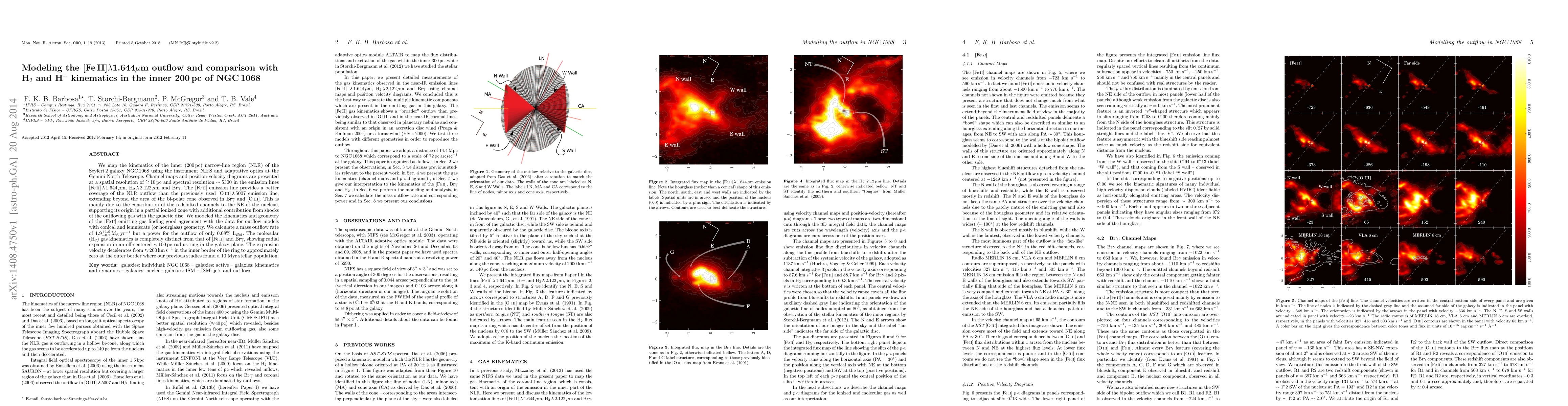 The study maps the narrow-line region (NLR) kinematics of Seyfert 2 galaxy NGC 1068 using high-resolution observations. [Fe II] emission at 1.644 μm is found to better trace the outflow than [O III] or Brγ, extending beyond Brγ's bipolar cone, suggesting origin in a partially ionized zone with shock contributions. Models show conical and lemniscate geometries fit the [Fe II] data, with a mass outflow rate of 1.9±0.7 M☉ yr⁻¹ but low power (0.08% L_Bol). Molecular H₂ gas, however, displays radial expansion in an off-centered ring, distinct from [Fe II] and Brγ kinematics.