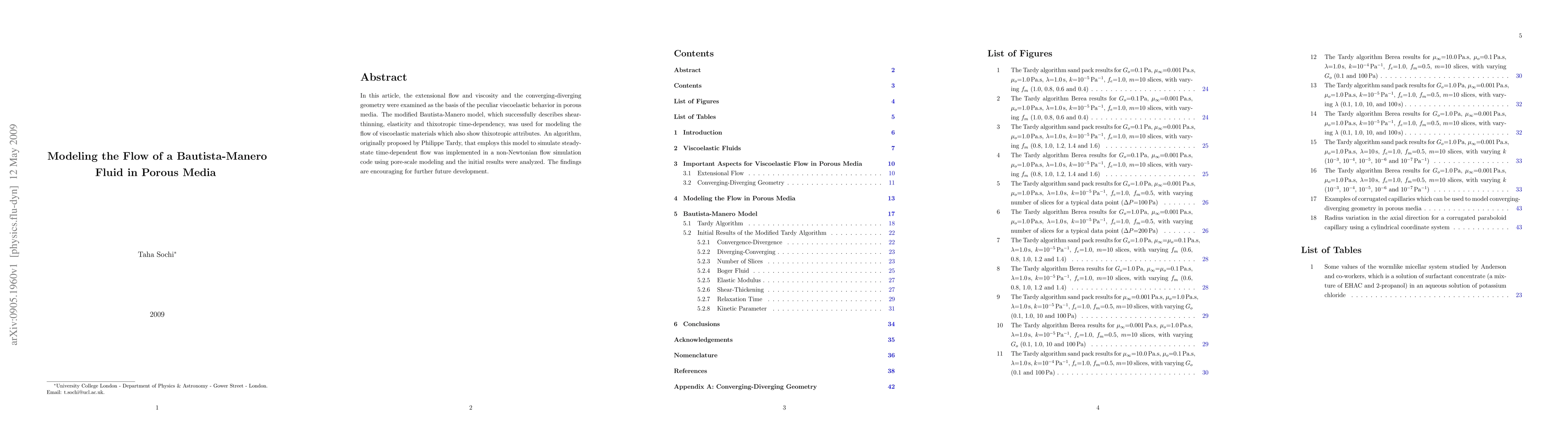 This paper models the flow of viscoelastic Bautista-Manero fluids in porous media using a modified model that captures shear-thinning, elasticity, and thixotropic time-dependency. Initial results from a simulation code employing pore-scale modeling show promising outcomes for further research.