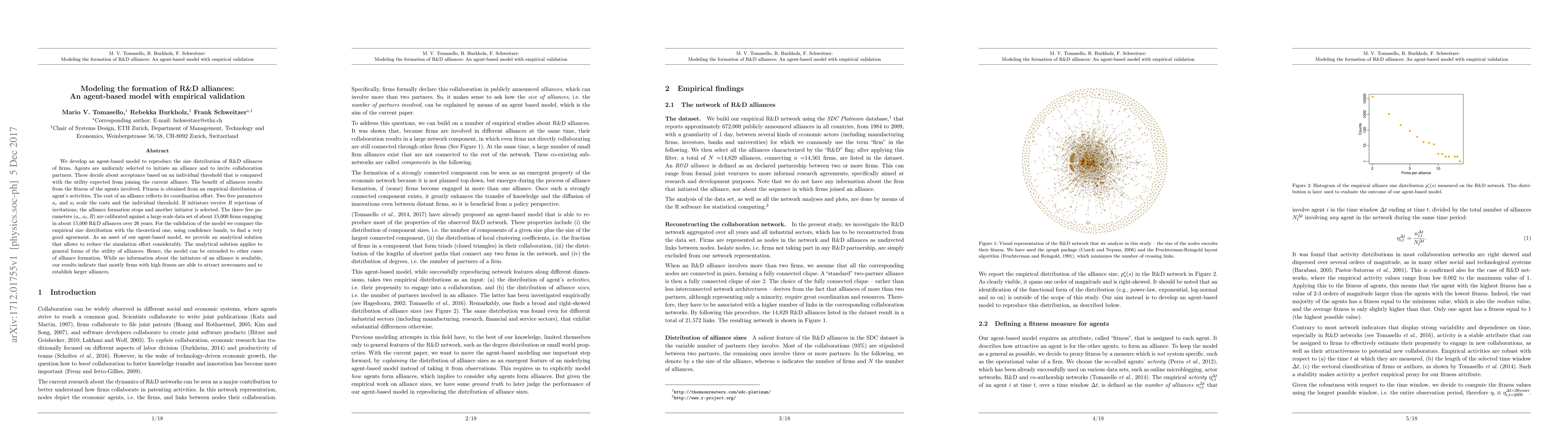 This paper develops an agent-based model to simulate the formation of R&D alliances among firms, calibrated against a large dataset. The model shows good agreement between empirical and theoretical size distributions of alliances, indicating that firms with high fitness tend to attract more partners and form larger alliances.