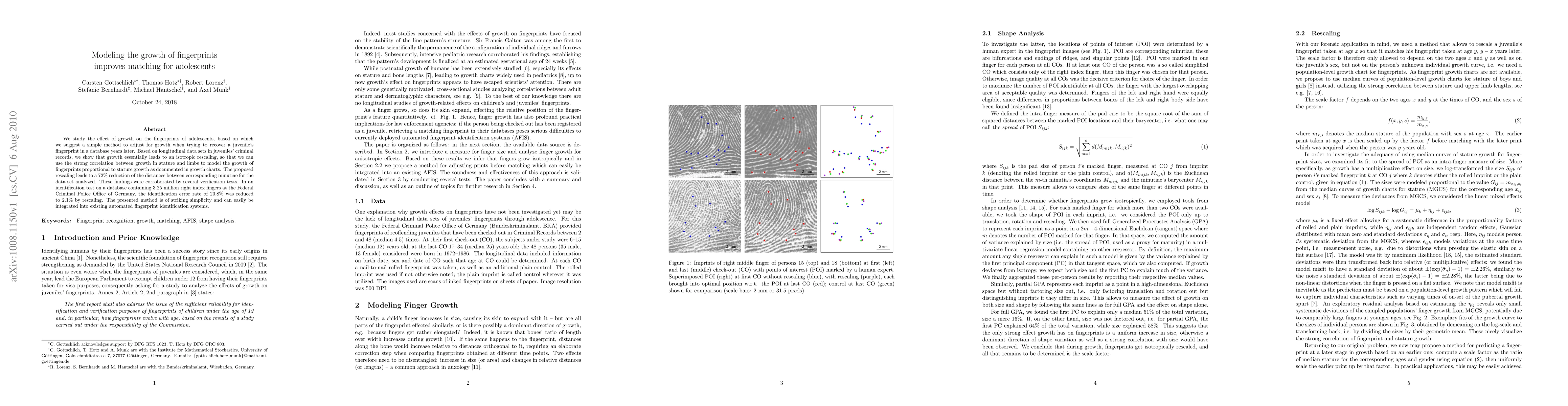 We study the effect of growth on the fingerprints of adolescents, based on which we suggest a simple method to adjust for growth when trying to recover a juvenile's fingerprint in a database years later. Based on longitudinal data sets in juveniles' criminal records, we show that growth essentially leads to an isotropic rescaling, so that we can use the strong correlation between growth in stature and limbs to model the growth of fingerprints proportional to stature growth as documented in growth charts. The proposed rescaling leads to a 72% reduction of the distances between corresponding minutiae for the data set analyzed. These findings were corroborated by several verification tests. In an identification test on a database containing 3.25 million right index fingers at the Federal Criminal Police Office of Germany, the identification error rate of 20.8% was reduced to 2.1% by rescaling. The presented method is of striking simplicity and can easily be integrated into existing automated fingerprint identification systems.