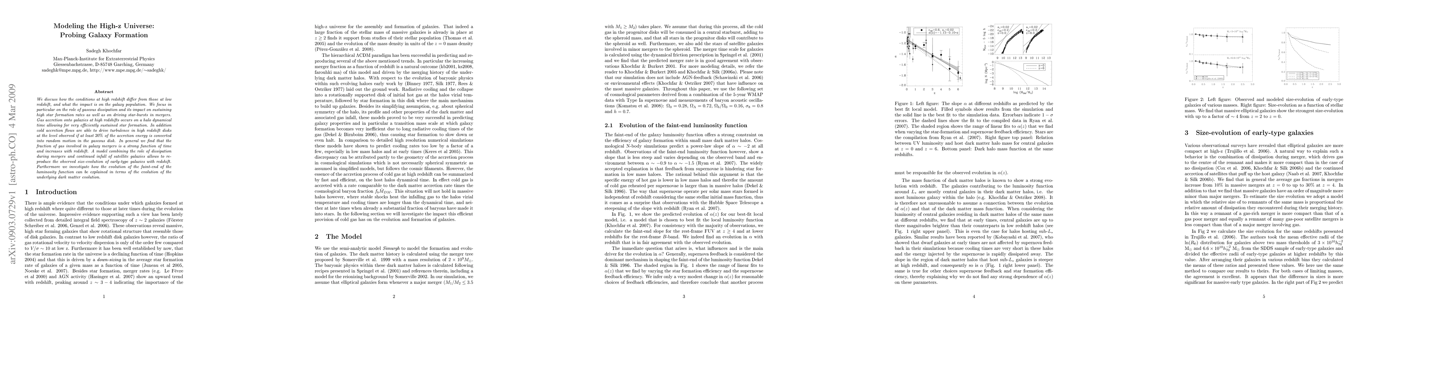 We discuss how the conditions at high redshift differ from those at low redshift, and what the impact is on the galaxy population. We focus in particular on the role of gaseous dissipation and its impact on sustaining high star formation rates as well as on driving star-bursts in mergers. Gas accretion onto galaxies at high redshifts occurs on a halo dynamical time allowing for very efficiently sustained star formation. In addition cold accretion flows are able to drive turbulence in high redshift disks at the level observed if at least 20% of the accretion energy is converted into random motion in the gaseous disk. In general we find that the fraction of gas involved in galaxy mergers is a strong function of time and increases with redshift. A model combining the role of dissipation during mergers and continued infall of satellite galaxies allows to reproduce the observed size-evolution of early-type galaxies with redshift. Furthermore we investigate how the evolution of the faint-end of the luminosity function can be explained in terms of the evolution of the underlying dark matter evolution.