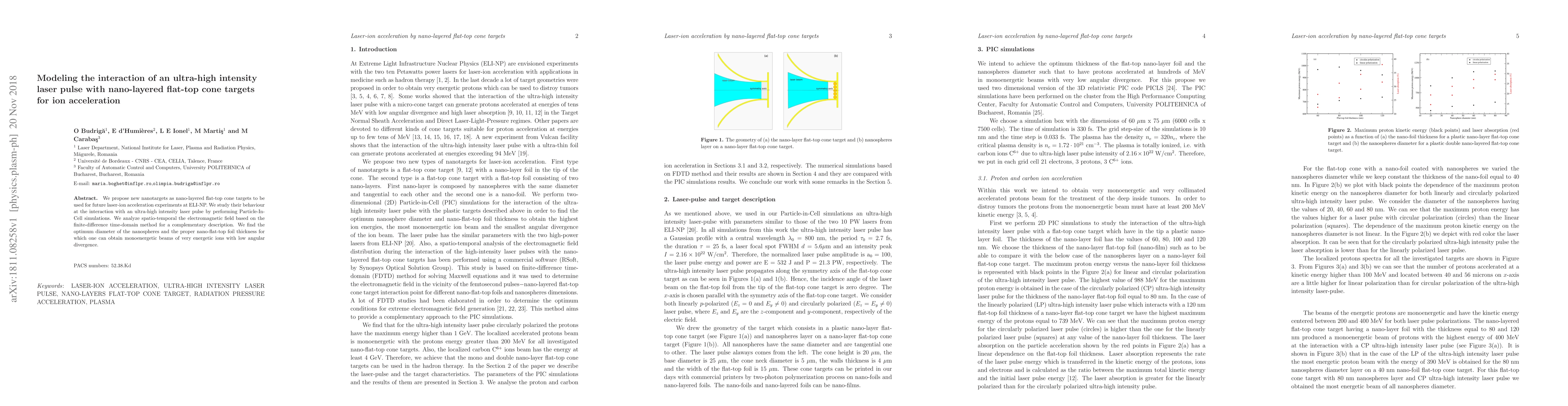 The paper presents detailed Particle-In-Cell and FDTD simulations to model the interaction of ultra-high intensity laser pulses with nano-layered flat-top cone targets, providing insights into optimizing ion acceleration for therapeutic applications.
