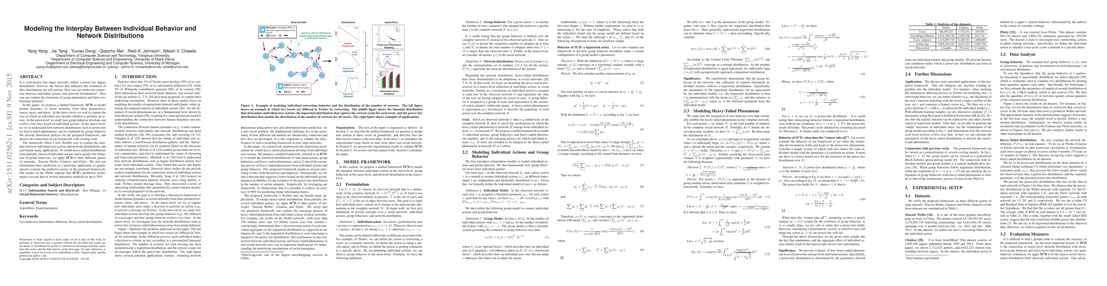 It is well-known that many networks follow a power-law degree distribution; however, the factors that influence the formation of their distributions are still unclear. How can one model the connection between individual actions and network distributions? How can one explain the formation of group phenomena and their evolutionary patterns? In this paper, we propose a unified framework, M3D, to model human dynamics in social networks from three perspectives: macro, meso, and micro. At the micro-level, we seek to capture the way in which an individual user decides whether to perform an action. At the meso-level, we study how group behavior develops and evolves over time, based on individual actions. At the macro-level, we try to understand how network distributions such as power-law (or heavy-tailed phenomena) can be explained by group behavior. We provide theoretical analysis for the proposed framework, and discuss the connection of our framework with existing work. The framework offers a new, flexible way to explain the interplay between individual user actions and network distributions, and can benefit many applications. To model heavy-tailed distributions from partially observed individual actions and to predict the formation of group behaviors, we apply M3D to three different genres of networks: Tencent Weibo, Citation, and Flickr. We also use information-burst prediction as a particular application to quantitatively evaluate the predictive power of the proposed framework. Our results on the Weibo indicate that M3D's prediction performance exceeds that of several alternative methods by up to 30\%.