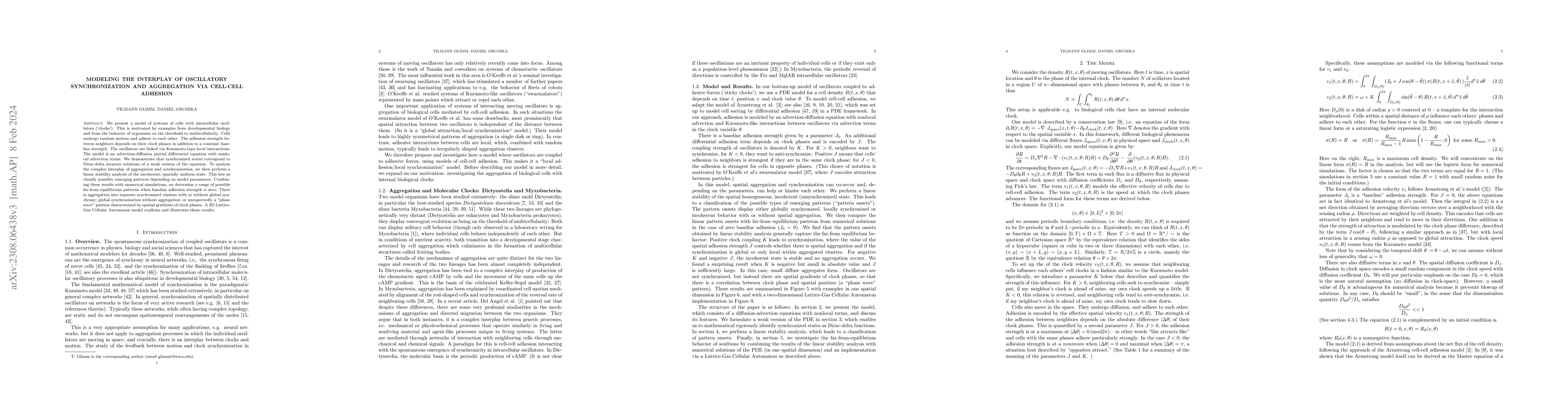 This paper models cell aggregation and synchronization via cell-cell adhesion, where oscillators (clocks) within cells interact through Kuramoto-type dynamics. It reveals various emergent patterns, including synchronized clusters, global synchronization, and phase wave patterns, through a combination of analytical and numerical methods.