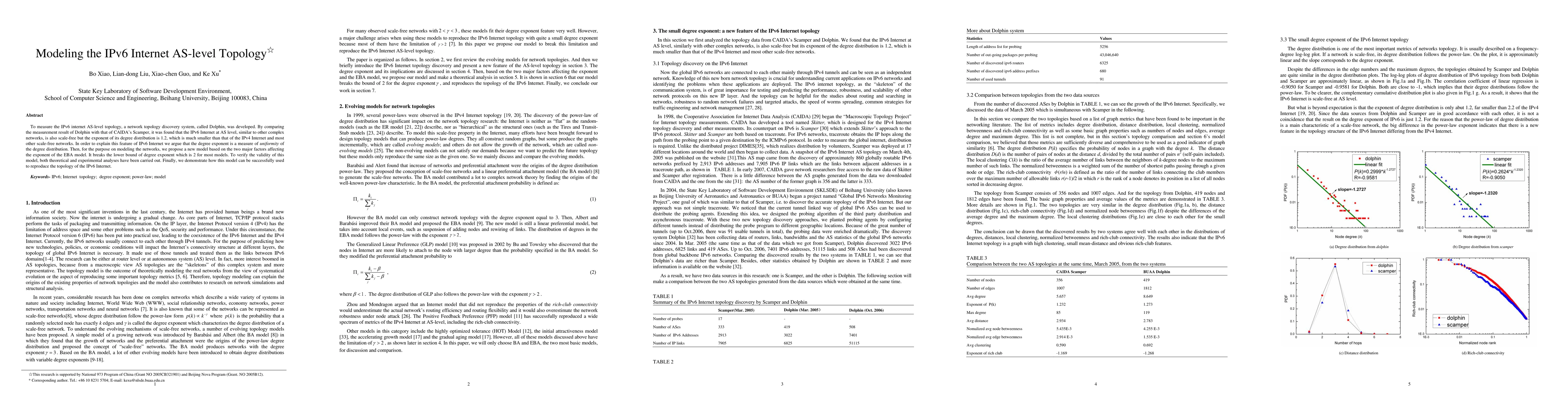 The paper introduces a new system, Dolphin, to measure the IPv6 Internet AS-level topology, finding it to be scale-free with a smaller degree distribution exponent compared to IPv4. A new model is proposed to explain this feature and successfully reproduce the IPv6 Internet topology.