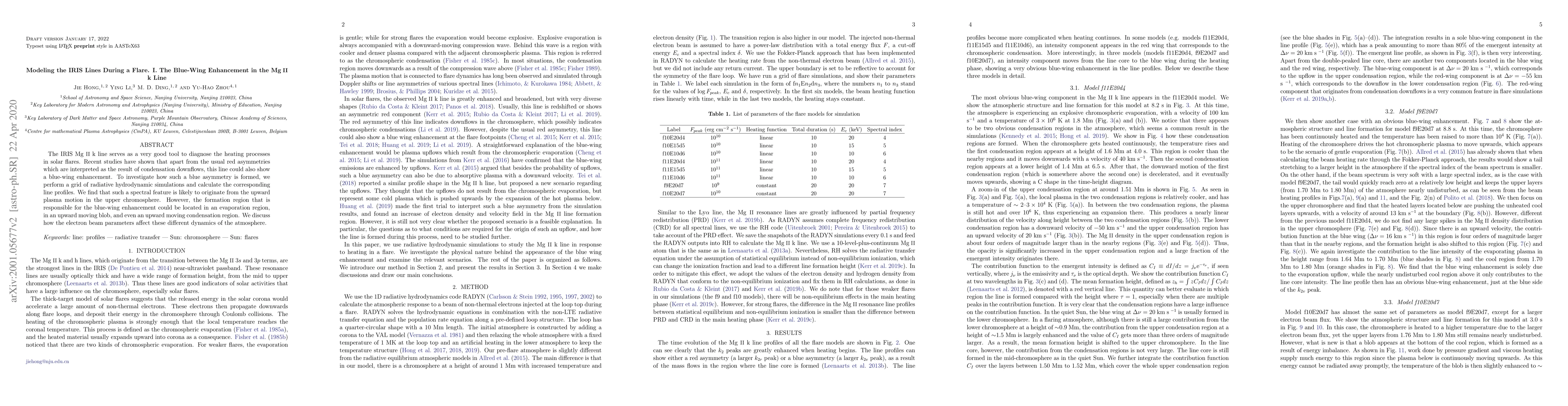 The IRIS Mg II k line serves as a very good tool to diagnose the heating processes in solar flares. Recent studies have shown that apart from the usual red asymmetries which are interpreted as the result of condensation downflows, this line could also show a blue-wing enhancement. To investigate how such a blue asymmetry is formed, we perform a grid of radiative hydrodynamic simulations and calculate the corresponding line profiles. We find that such a spectral feature is likely to originate from the upward plasma motion in the upper chromosphere. However, the formation region that is responsible for the blue-wing enhancement could be located in an evaporation region, in an upward moving blob, and even an upward moving condensation region. We discuss how the electron beam parameters affect these different dynamics of the atmosphere.