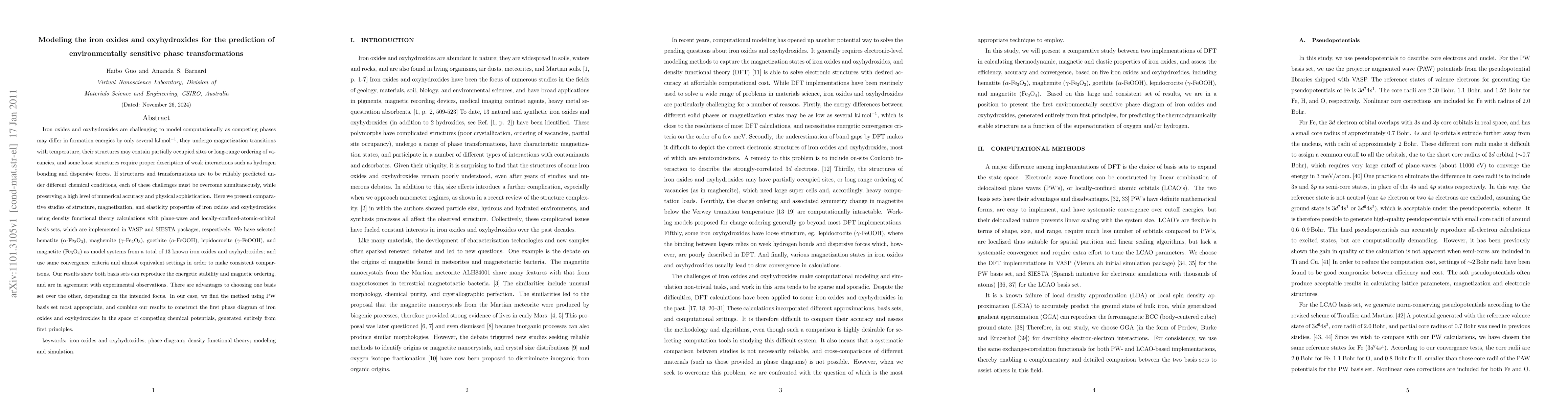 This paper models iron oxides and oxyhydroxides using density functional theory to predict environmentally sensitive phase transformations. The study compares the effectiveness of plane-wave and locally-confined-atomic-orbital basis sets in VASP and SIESTA to accurately describe structural, magnetic, and elastic properties, ultimately favoring the plane-wave basis set for its accuracy and constructing a comprehensive phase diagram from first principles.