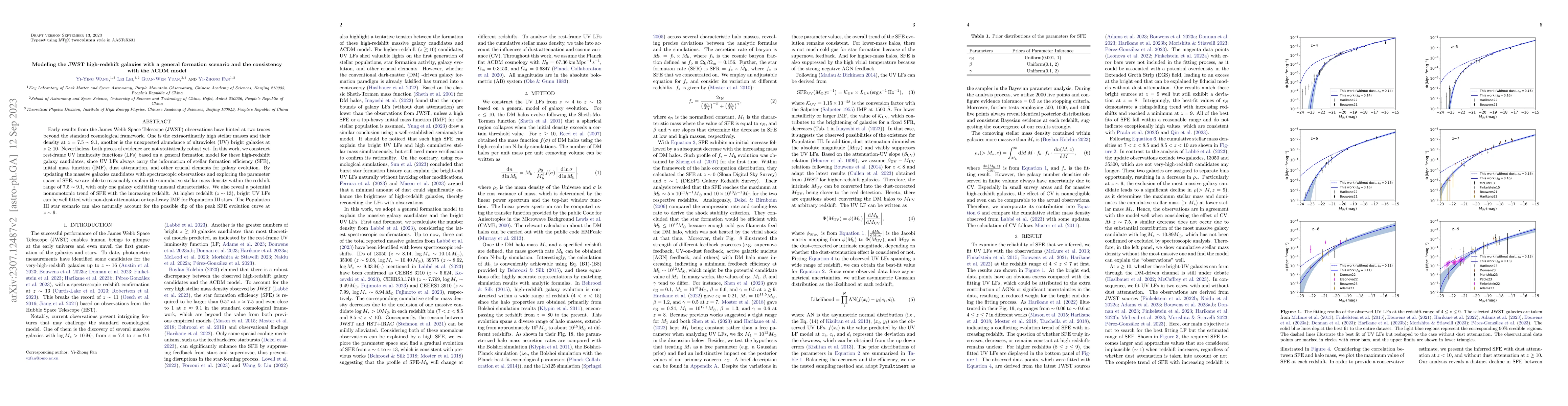 This paper models high-redshift galaxies observed by the JWST using a general formation scenario, finding that stellar mass density and UV luminosity functions can be explained by updated massive galaxy candidates and varying stellar formation efficiency. It suggests a nonmonotonic trend in SFE with redshift and proposes Population III stars as a possible explanation for UV bright galaxies at $z\ge10$.