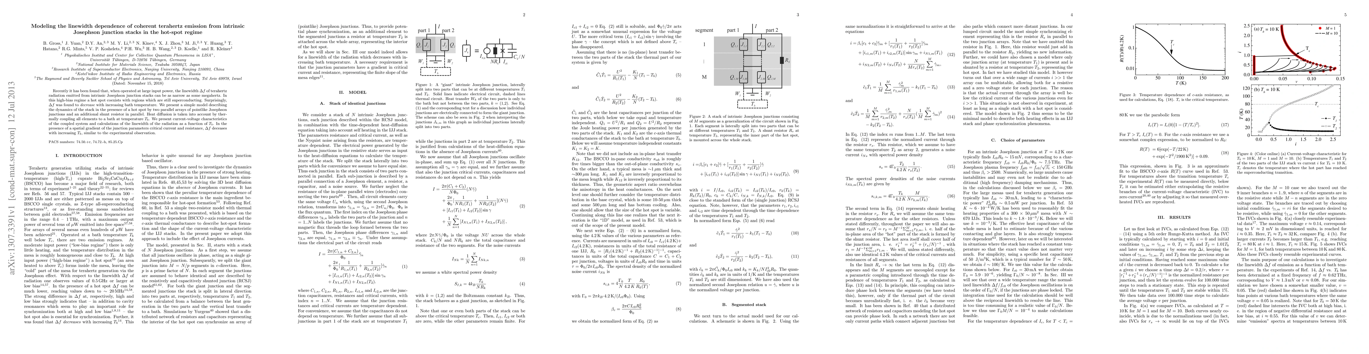 This paper models the coherent terahertz emission from intrinsic Josephson junction stacks in the hot-spot regime, showing that linewidth narrows with increasing bath temperature. The model uses parallel arrays of Josephson junctions and a shunt resistor, incorporating heat diffusion to explain the observed linewidth behavior.
