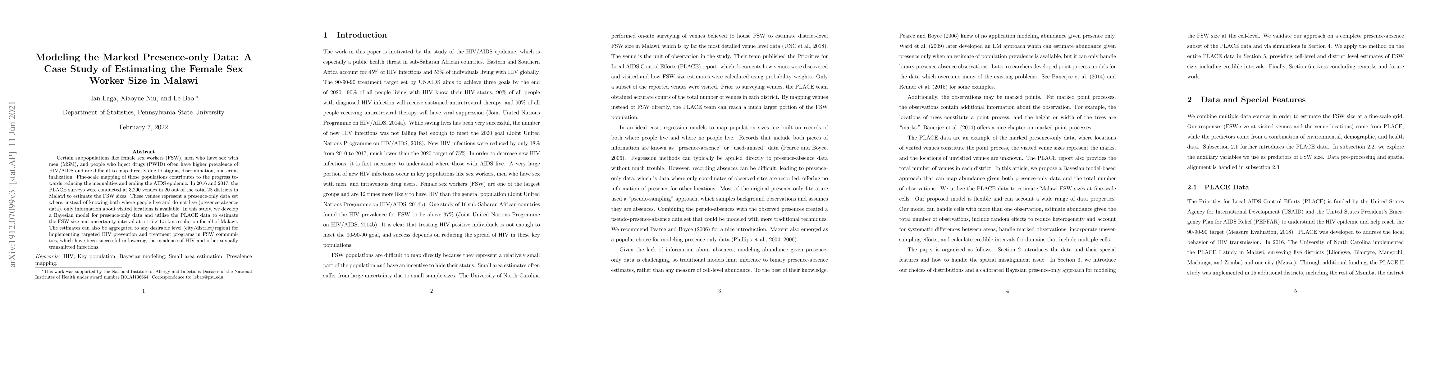 Researchers used Bayesian modeling to estimate the size of female sex workers in Malawi from presence-only data, aiming to inform targeted HIV prevention and treatment programs. They successfully mapped FSW sizes at a $1.5 imes 1.5$-km resolution across all of Malawi.
