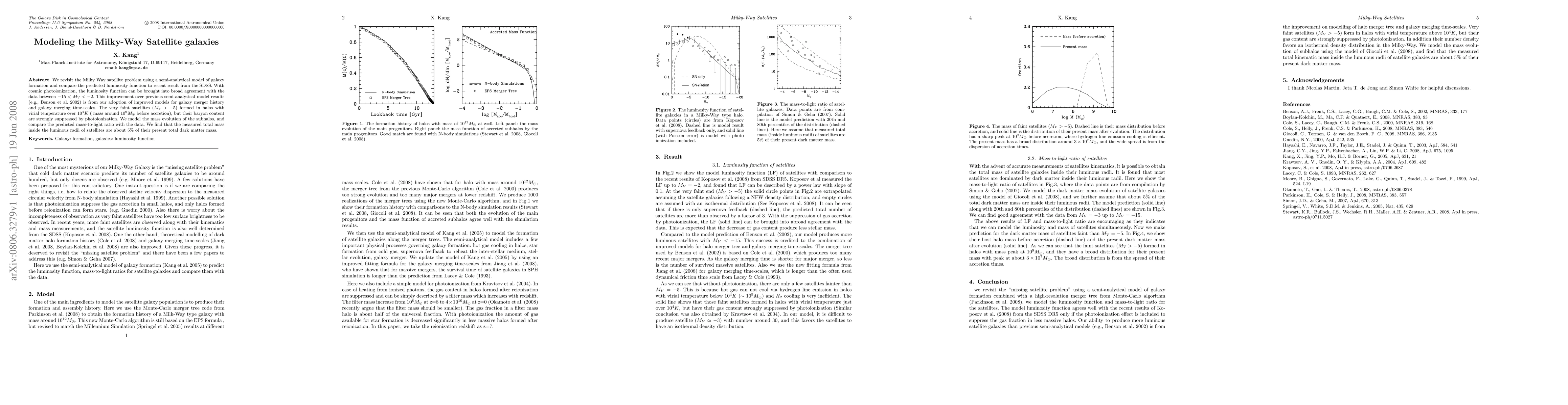 This research uses an updated semi-analytical galaxy formation model to better match the luminosity function of Milky Way satellite galaxies with SDSS data. Key improvements include revised merger history and time-scale models. Faint satellites form in massive halos but have suppressed baryon content due to photoionization. The study also finds that observed satellite masses are about 5% of their total dark matter mass.