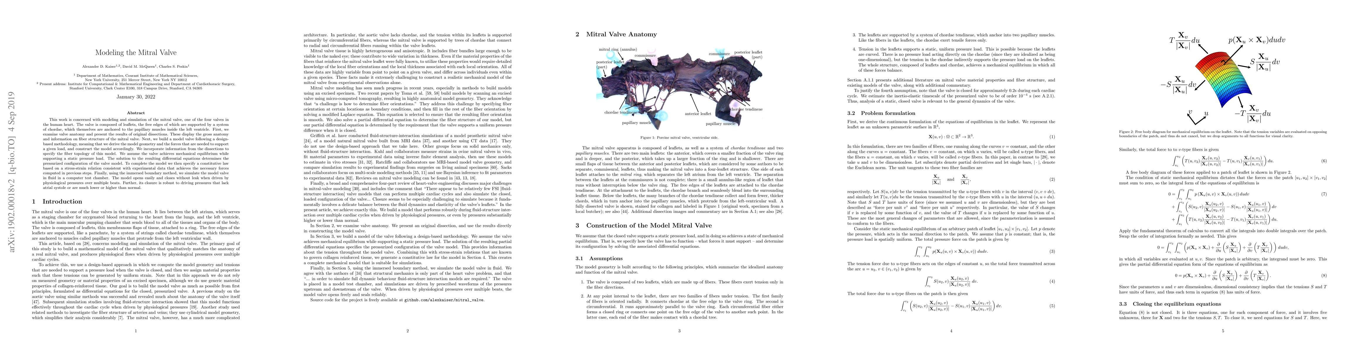 This work is concerned with modeling and simulation of the mitral valve, one of the four valves in the human heart. The valve is composed of leaflets, the free edges of which are supported by a system of chordae, which themselves are anchored to the papillary muscles inside the left ventricle. First, we examine valve anatomy and present the results of original dissections. These display the gross anatomy and information on fiber structure of the mitral valve. Next, we build a model valve following a design-based methodology, meaning that we derive the model geometry and the forces that are needed to support a given load, and construct the model accordingly. We incorporate information from the dissections to specify the fiber topology of this model. We assume the valve achieves mechanical equilibrium while supporting a static pressure load. The solution to the resulting differential equations determines the pressurized configuration of the valve model. To complete the model we then specify a constitutive law based on a stress-strain relation consistent with experimental data that achieves the necessary forces computed in previous steps. Finally, using the immersed boundary method, we simulate the model valve in fluid in a computer test chamber. The model opens easily and closes without leak when driven by physiological pressures over multiple beats. Further, its closure is robust to driving pressures that lack atrial systole or are much lower or higher than normal.
