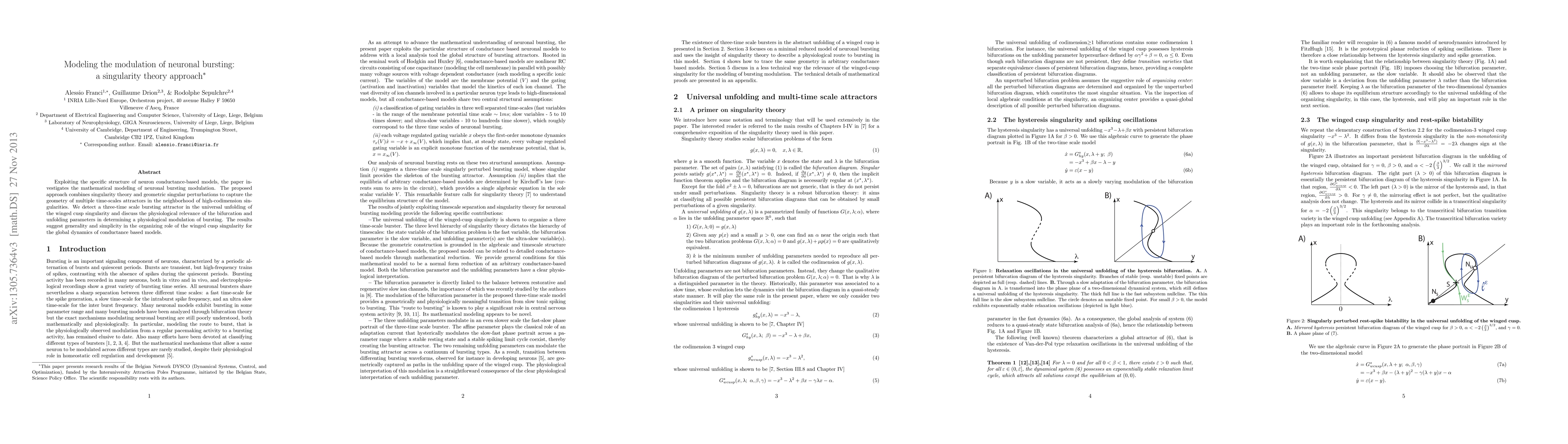 The paper proposes a singularity theory approach to model neuronal bursting modulation by utilizing geometric singular perturbations and detecting a three-time scale bursting attractor linked to the winged cusp singularity, highlighting its physiological relevance in modulating bursting dynamics. The method reveals the universal unfolding of singularities that simplifies the global dynamics in conductance-based neuron models.