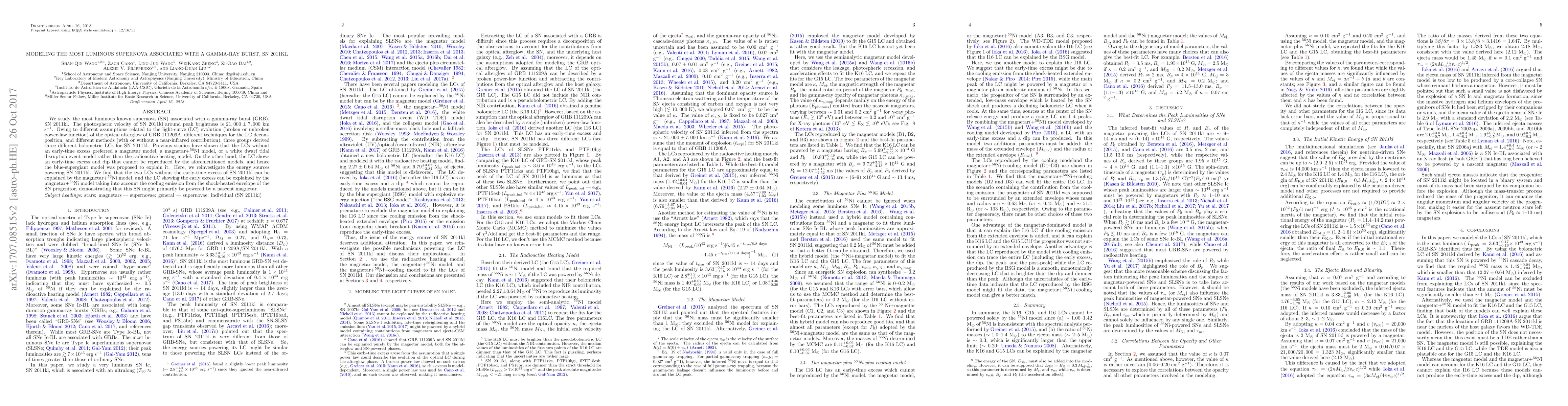 This paper investigates the energy sources powering the most luminous supernova SN 2011kl, associated with a gamma-ray burst. It finds that the magnetar+$^{56}$Ni model best explains the light curves, with the early-time excess likely due to cooling emission from the shock-heated progenitor envelope, suggesting a nascent magnetar as the primary energy source.