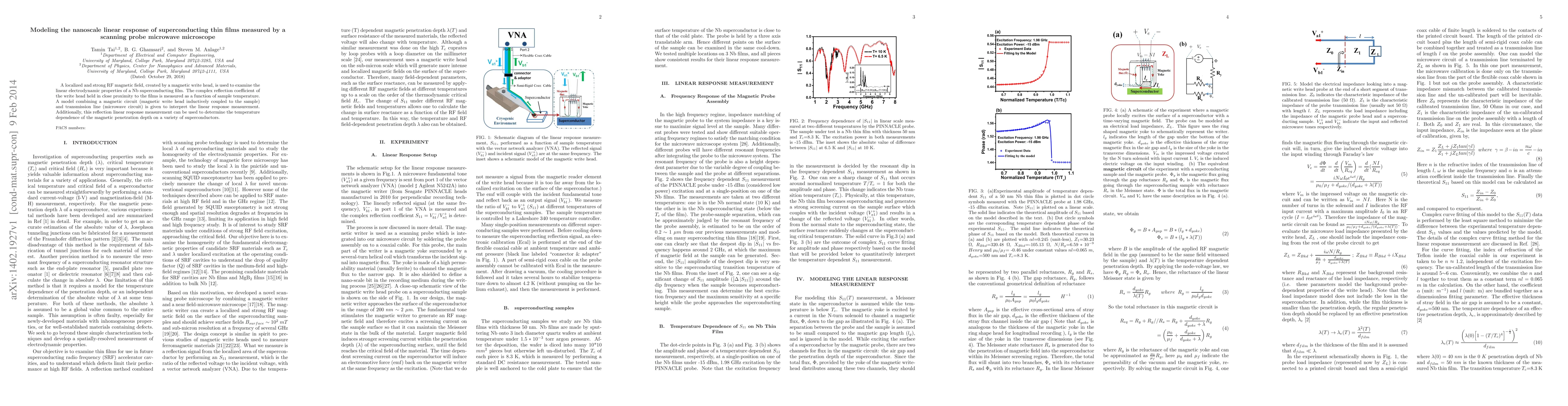 This study models the linear response of Nb superconducting thin films under an RF magnetic field from a magnetic write head, using a scanning probe microwave microscope. The complex reflection coefficient is measured to interpret the films' electrodynamic properties and determine temperature-dependent magnetic penetration depth.