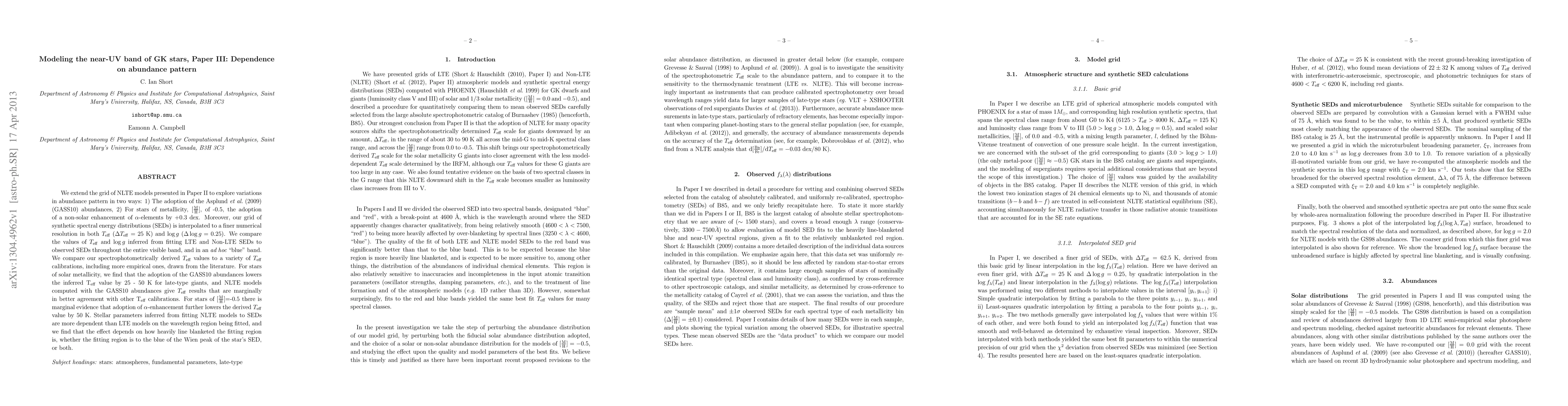 We extend the grid of NLTE models presented in Paper II to explore variations in abundance pattern in two ways: 1) The adoption of the Asplund et al. (2009) (GASS10) abundances, 2) For stars of metallicity, [M/H], of -0.5, the adoption of a non-solar enhancement of alpha-elements by +0.3 dex. Moreover, our grid of synthetic spectral energy distributions (SEDs) is interpolated to a finer numerical resolution in both T_eff (Delta T_eff = 25 K) and log g (Delta log g = 0.25). We compare the values of T_eff and log g inferred from fitting LTE and Non-LTE SEDs to observed SEDs throughout the entire visible band, and in an ad hoc "blue" band. We compare our spectrophotometrically derived T_eff values to a variety of T_eff calibrations, including more empirical ones, drawn from the literature. For stars of solar metallicity, we find that the adoption of the GASS10 abundances lowers the inferred T_eff value by 25 - 50 K for late-type giants, and NLTE models computed with the GASS10 abundances give T_eff results that are marginally in better agreement with other T_eff calibrations. For stars of [M/H]=-0.5 there is marginal evidence that adoption of alpha-enhancement further lowers the derived T_eff value by 50 K. Stellar parameters inferred from fitting NLTE models to SEDs are more dependent than LTE models on the wavelength region being fitted, and we find that the effect depends on how heavily line blanketed the fitting region is, whether the fitting region is to the blue of the Wien peak of the star's SED, or both.