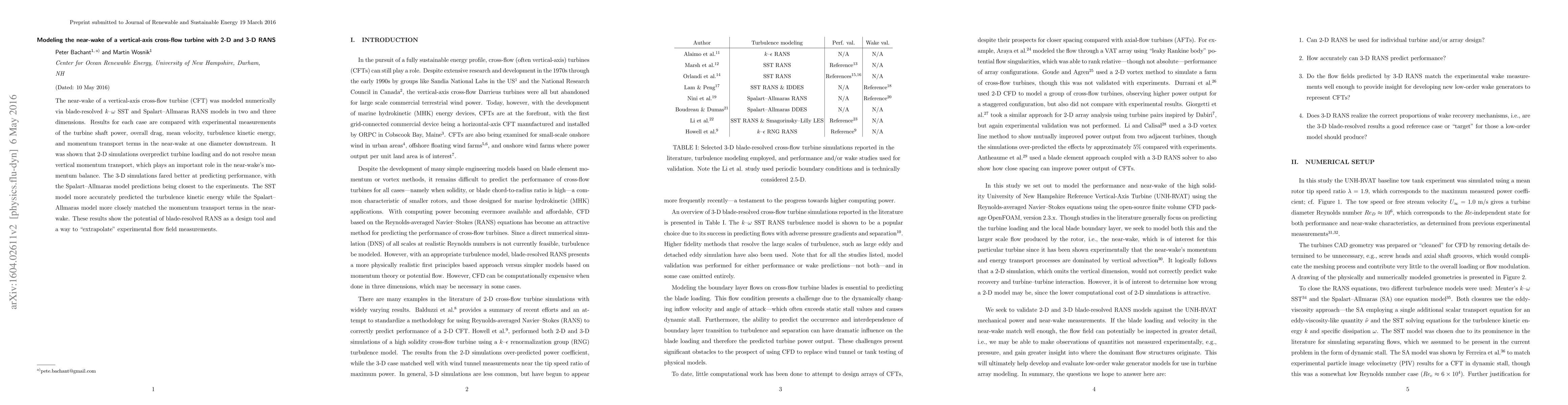 Researchers used numerical models to study the near-wake of a vertical-axis cross-flow turbine and found that 3D simulations predicted performance better than 2D simulations, with one model performing closest to experimental measurements.